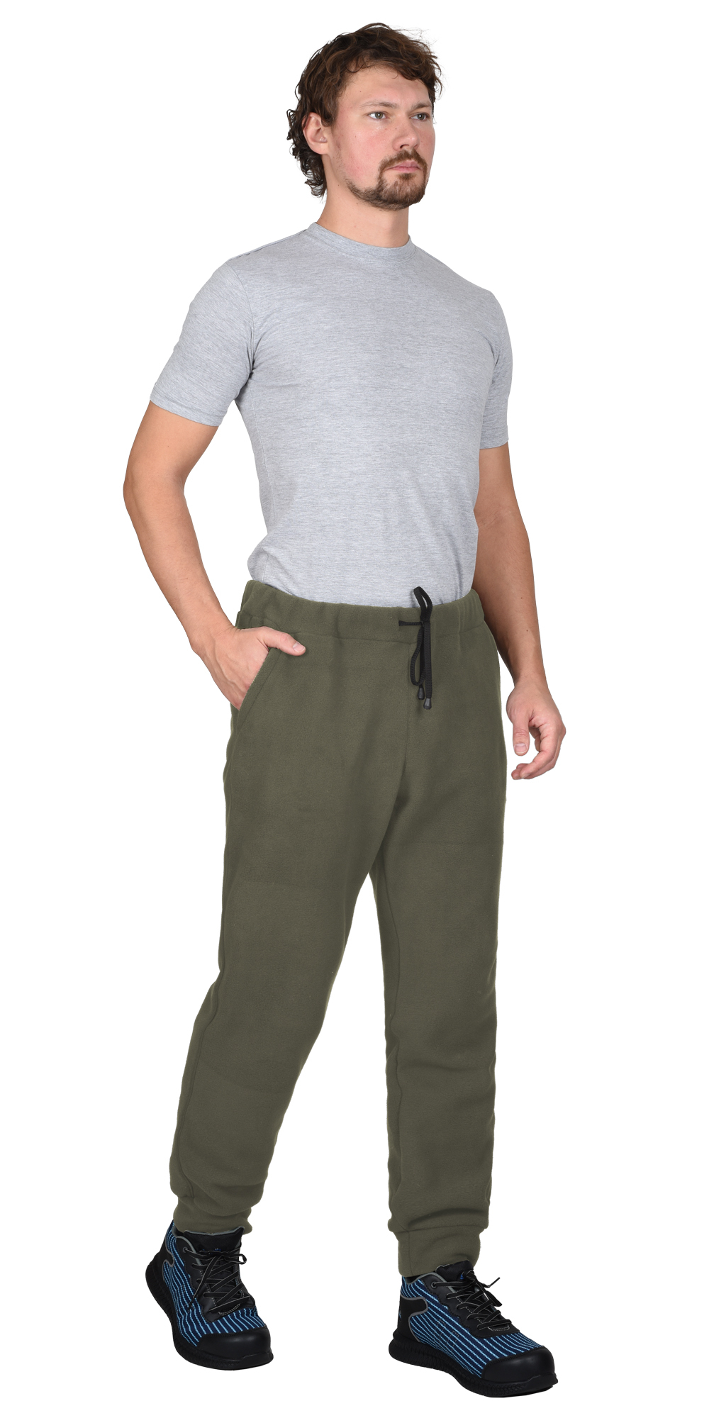 Брюки из флиса прямые с притачным поясом на резинке и со шнуром. Брюки с внутренними боковыми карманами с наклонным входом, по боковым швам кант. По низу брюк притачные манжеты.
