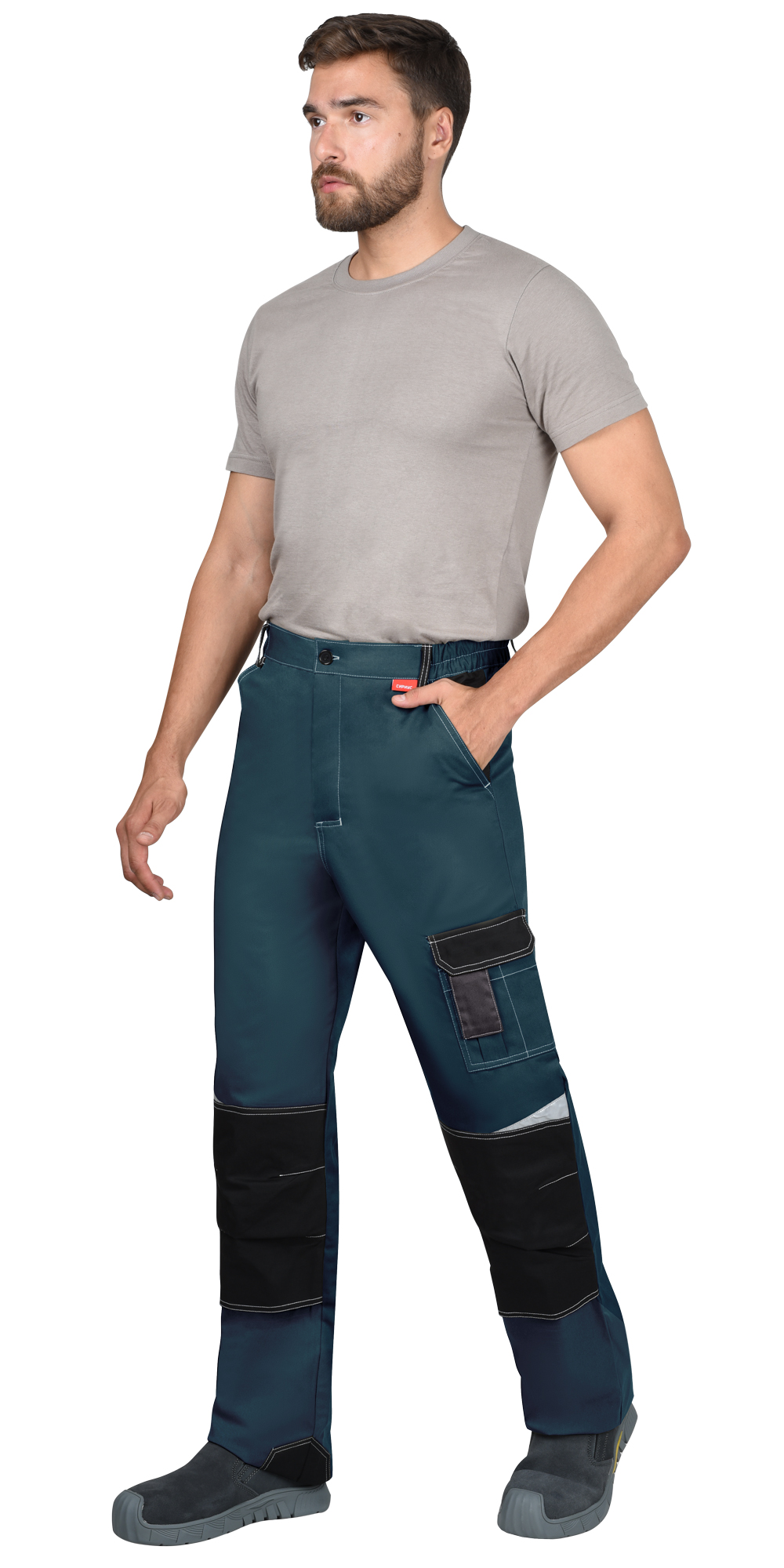Брюки с застёжкой спереди – гульфик с молнией, с отрезным поясом, застегивается на пуговицу, с боковыми внутренними карманами на передних половинках, с накладными карманами на правой задней половинке и на левом боковом шве. Брюки с объемными наколенниками с нижним входом для амортизационного вкладыша. В брюках предусмотрены светоотражающие элементы, для обозначения сигнальной видимости.