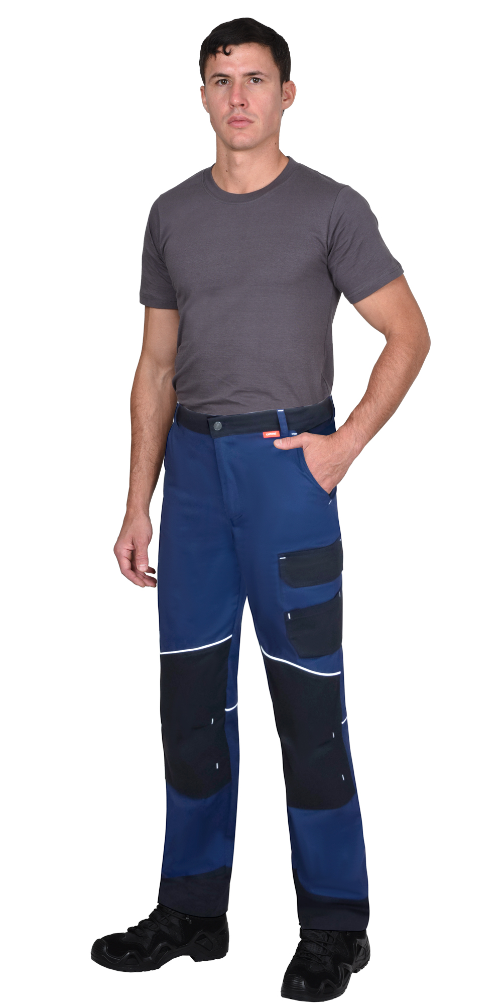 Брюки со световозвращающим кантом, прямого кроя, с отрезным поясом, частично стянутым эластичной тесьмой сзади, застежкой в среднем шве передних половинок – гульфик с тесьмой «молния», различными многофункциональными карманами, объёмными наколенниками.