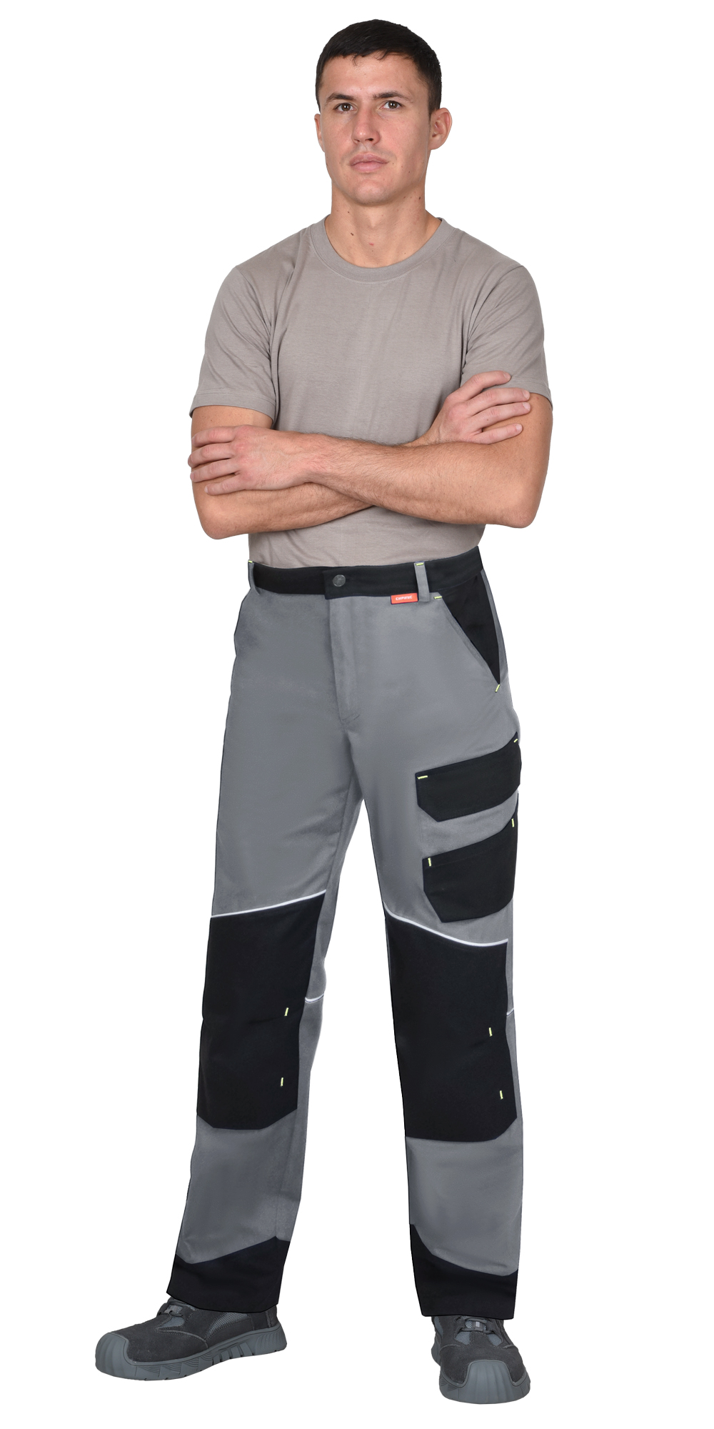 Брюки со световозвращающим кантом, прямого кроя, с отрезным поясом, частично стянутым эластичной тесьмой сзади, застежкой в среднем шве передних половинок – гульфик с тесьмой «молния», различными многофункциональными карманами, объёмными наколенниками.