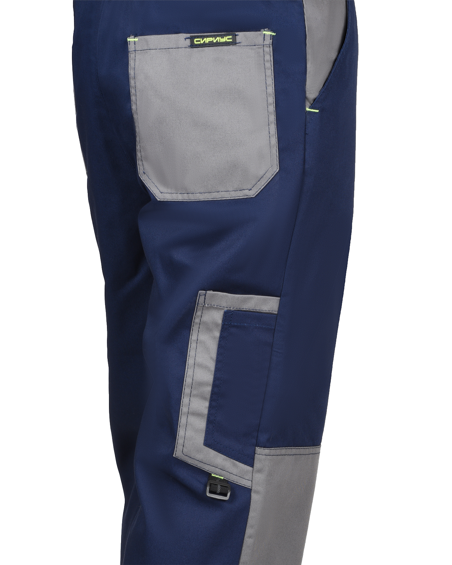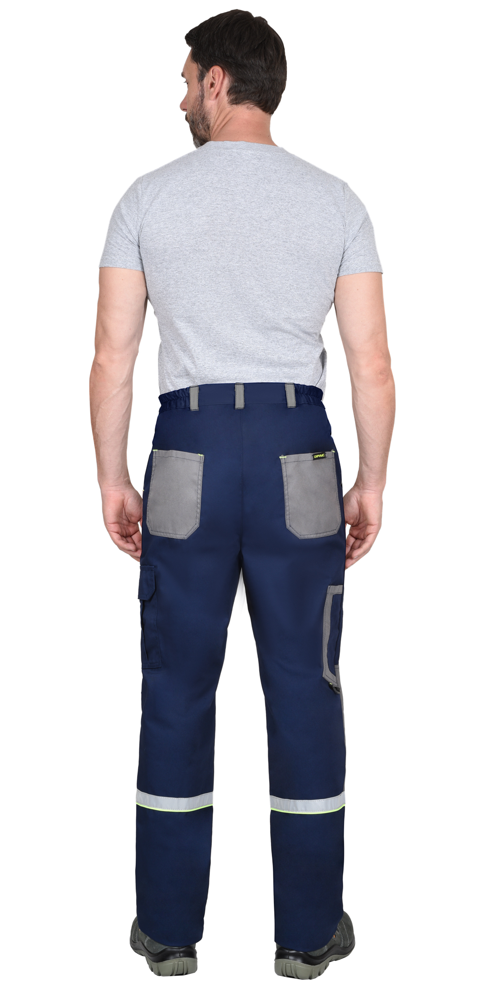 Брюки прямые, с застёжкой спереди на молнию, с отрезным поясом, с частичной стяжкой на резинку по бокам и застёжкой на пуговицу, со шлевками, с внутренними боковыми карманами, с наколенниками, с накладным карманом с клапаном на липучке на левом боковом шве, с задними накладными карманами и карманами для инструментов. Брюки со светоотражающими элементами.