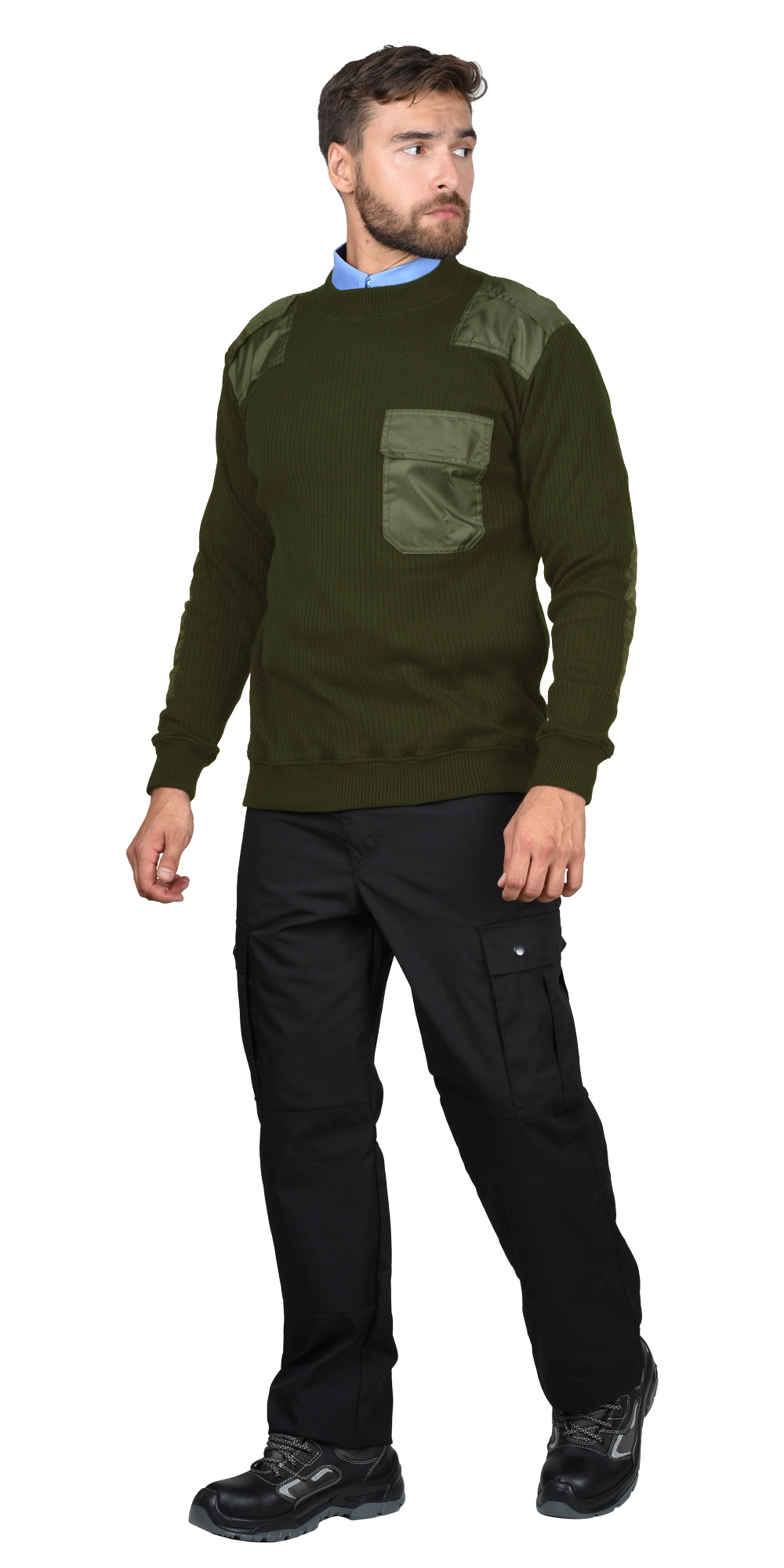 Джемпер форменный для сотрудников охранных предприятий с круглым вырезом и с усилительными накладками в области плеч и локтей, для защиты от протирания и более длительного использования джемпера. Джемпер с накладным карманом и погонами из курточной ткани. Длинные рукава обеспечивают полную защиту рук, а эластичная манжета на рукаве удерживает тепло.