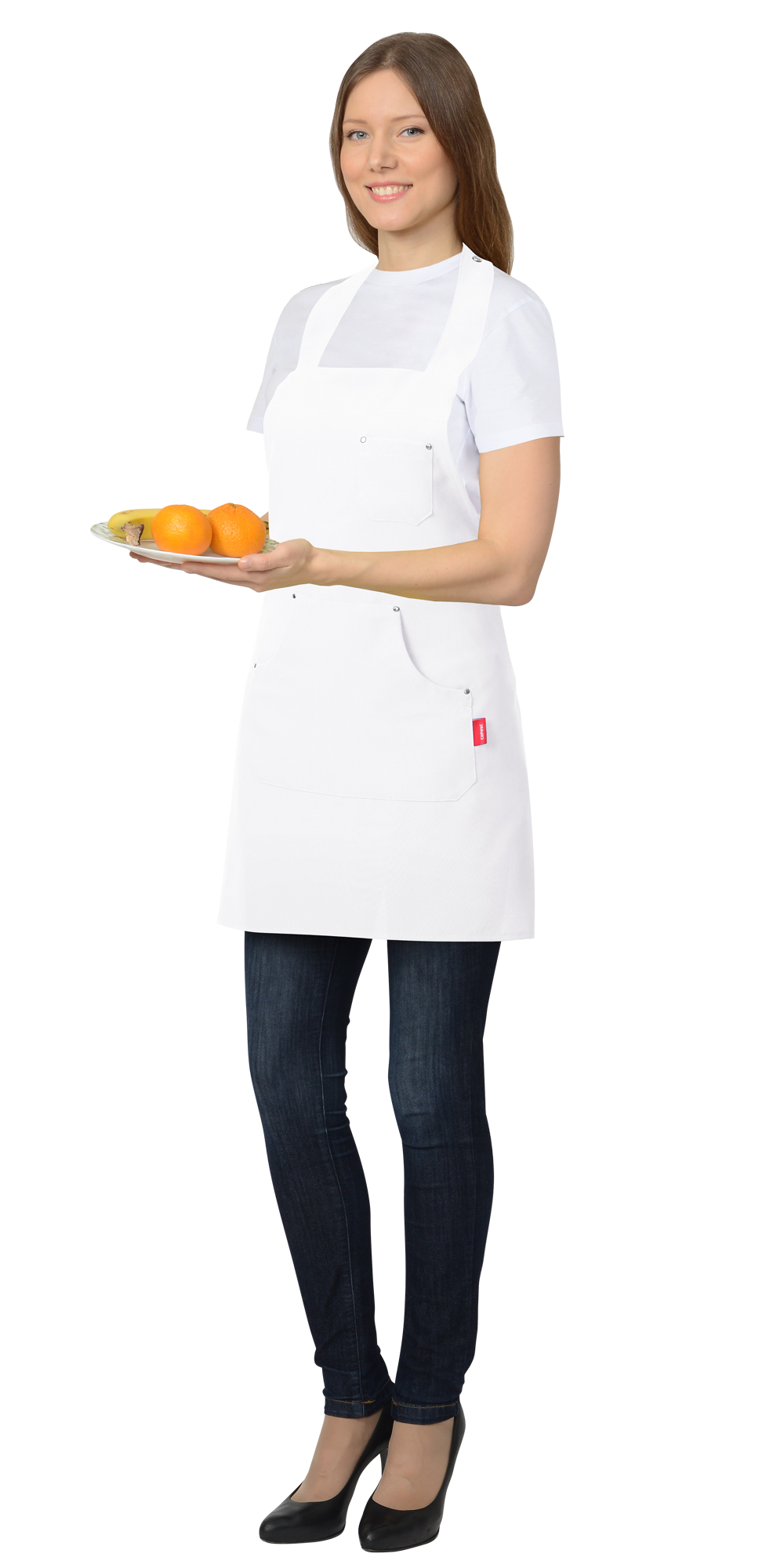 Фартук с нагрудником, с прямой линией низа и прямыми боковыми сторонами, боковыми завязками для регулировки фартука на фигуре, и шейной бретелью, застёгивающейся сзади на 3 кнопки справа налево для регулировки длины бретели по горловине. Фартук с большим накладным карманом с двумя боковыми входами и малым нагрудным карманом. Концы входа в карманы укреплены хольнитенами.