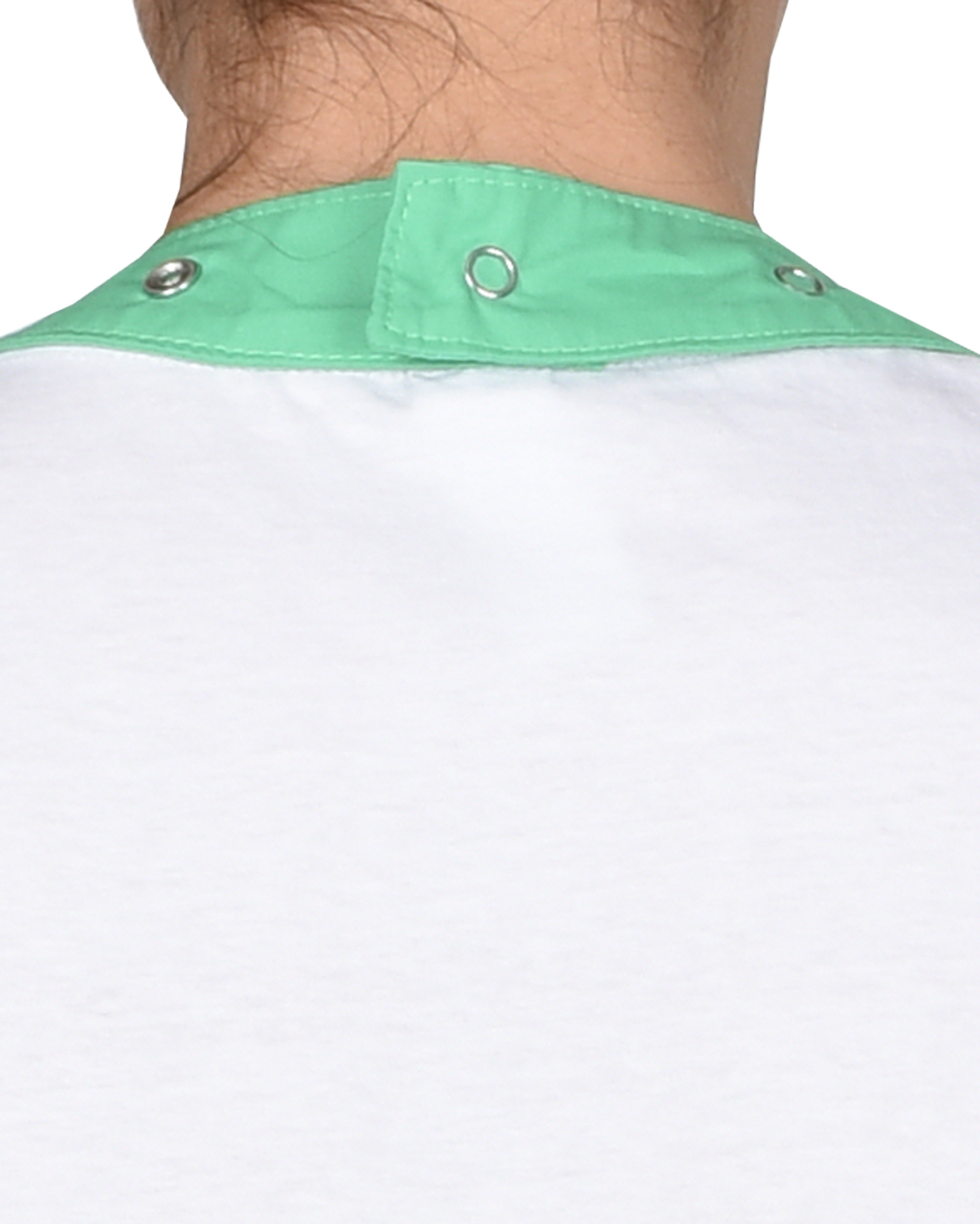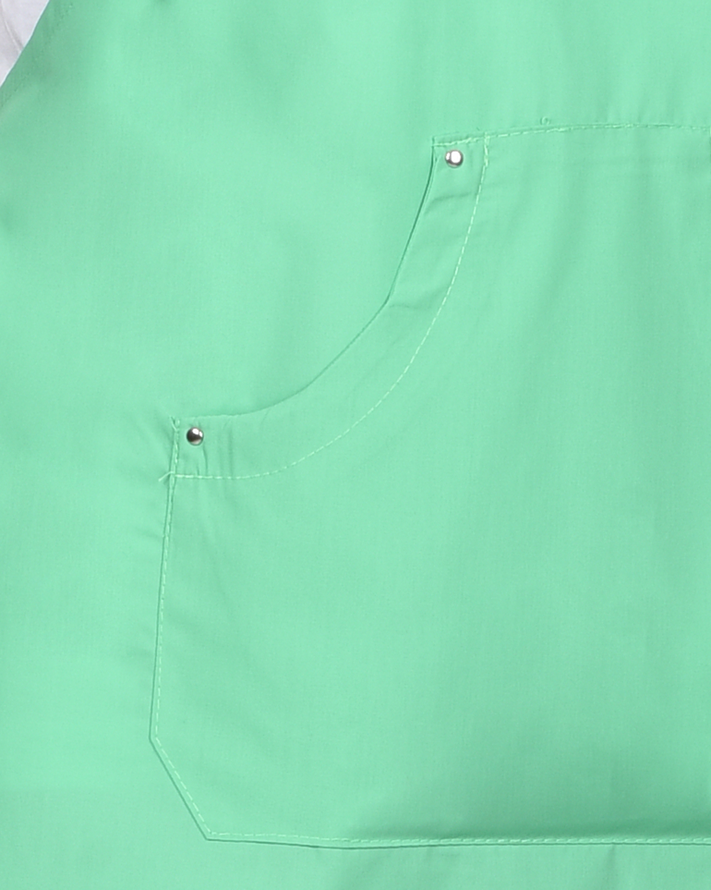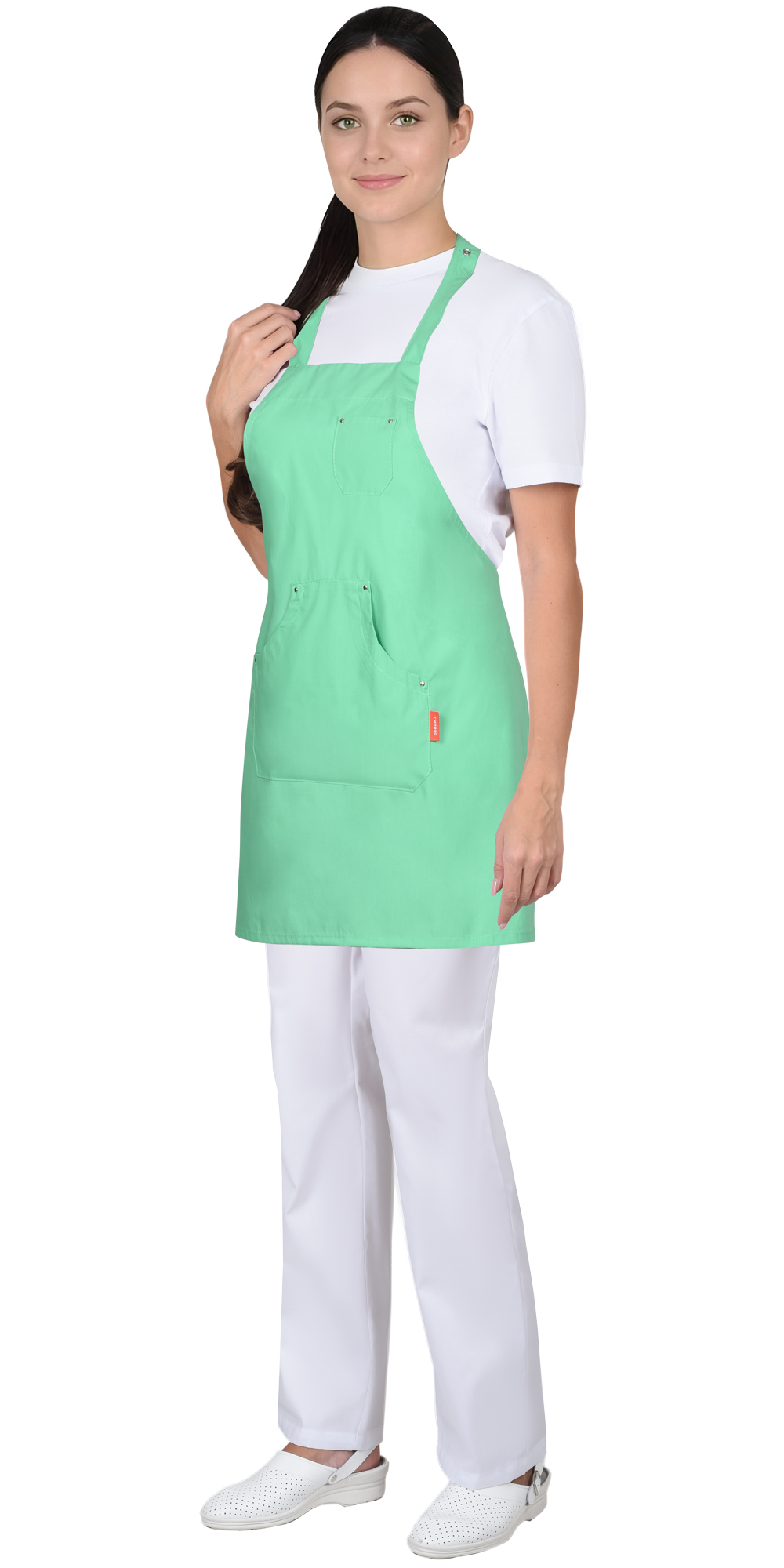 Фартук с нагрудником, с прямой линией низа и прямыми боковыми сторонами, боковыми завязками для регулировки фартука на фигуре, и шейной бретелью, застёгивающейся сзади на 3 кнопки справа налево для регулировки длины бретели по горловине. Фартук с большим накладным карманом с двумя боковыми входами и малым нагрудным карманом. Концы входа в карманы укреплены хольнитенами.