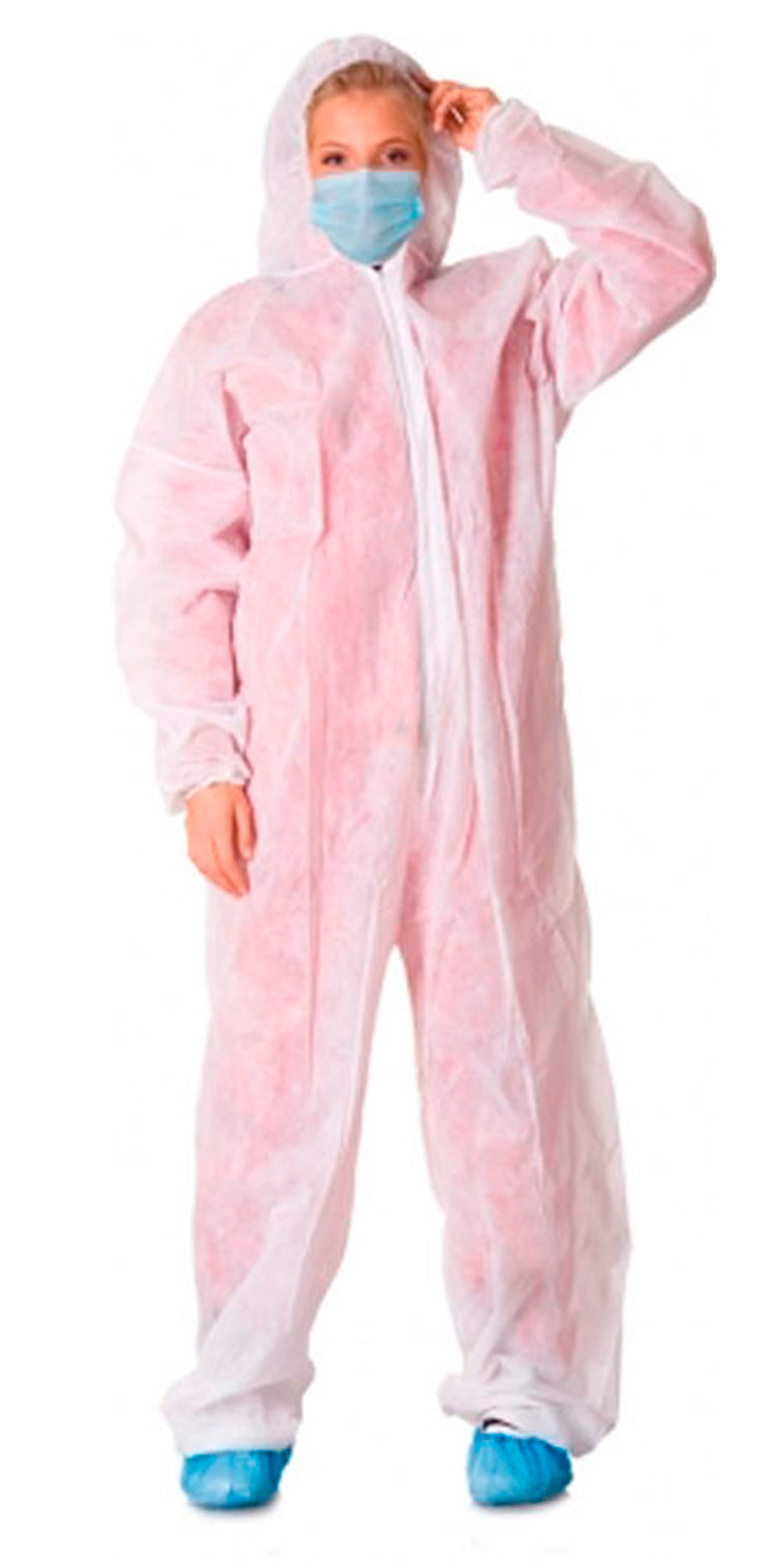 Одноразовый комбинезон белого цвета изготовлен из гипоаллергенного нетканого материала спанбонд плотностью 30гр/м.кв.