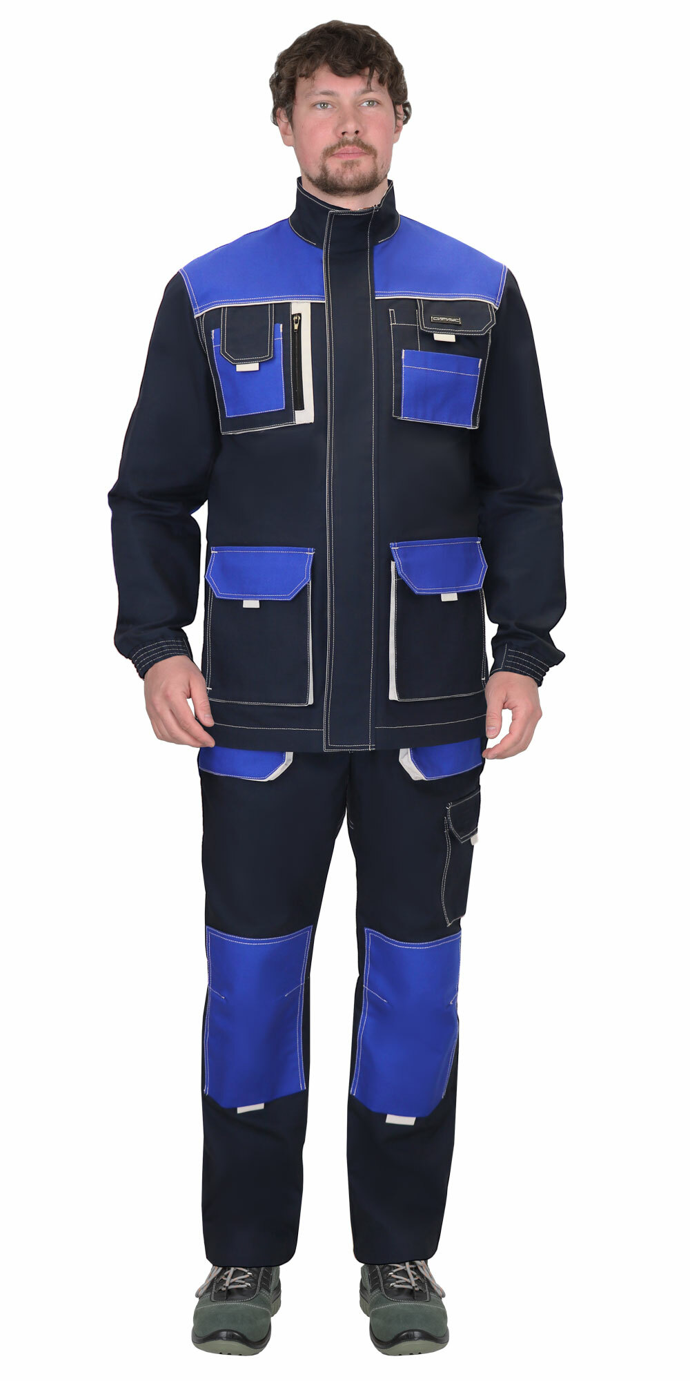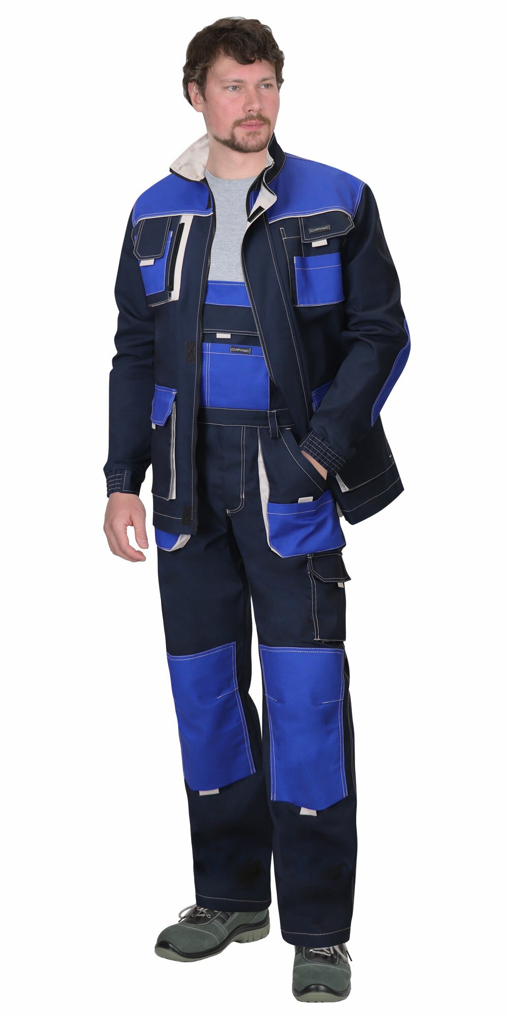 Костюм имеет множество многофункциональных накладных комбинированных объемных карманов с контрастной отделкой. На манжетах рукавов и в области талии на полукомбинезоне по всей ширине вставлена резинка для лучшего прилегания к телу. Куртка снабжена качественной центральной бортовой застёжкой на молнию. Объемные наколенники защищают колени от сквозного истирания. Костюм хорошо зарекомендовал себя в работе и является популярной моделью.
