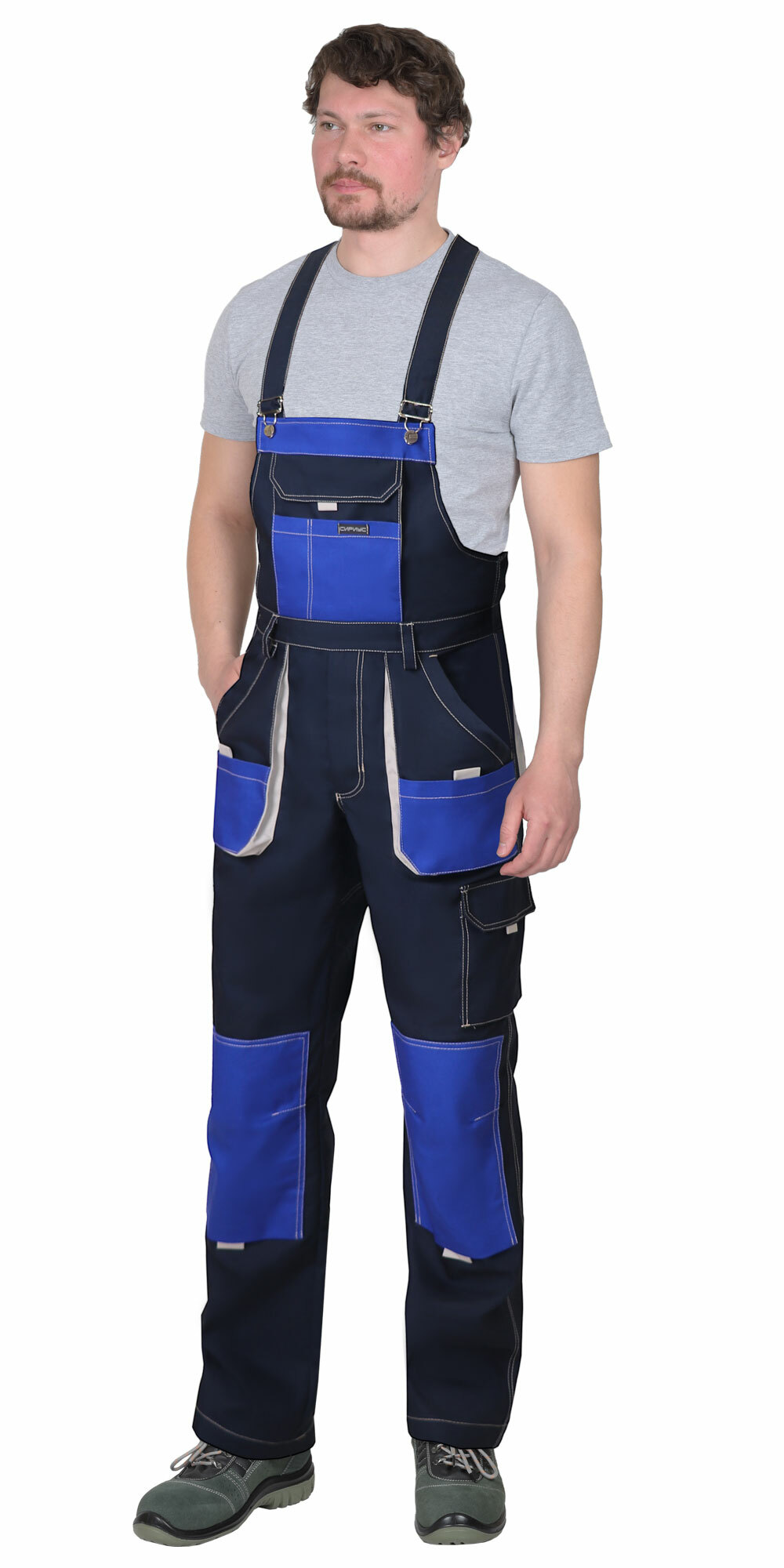 Полукомбинезон с застёжкой спереди - гульфик с молнией и с застёжкой в правом боковом шве на пуговицы, с наколенниками, с бретелями. Полукомбинезон спереди и сзади с накладными карманами. Спереди с нагрудным карманом с клапаном, на липучке. Сзади полукомбинезон по талии стянут резинкой для лучшего прилегания по фигуре. Бретели с резинкой, длина бретелей регулируется при помощи металлической пряжки.
