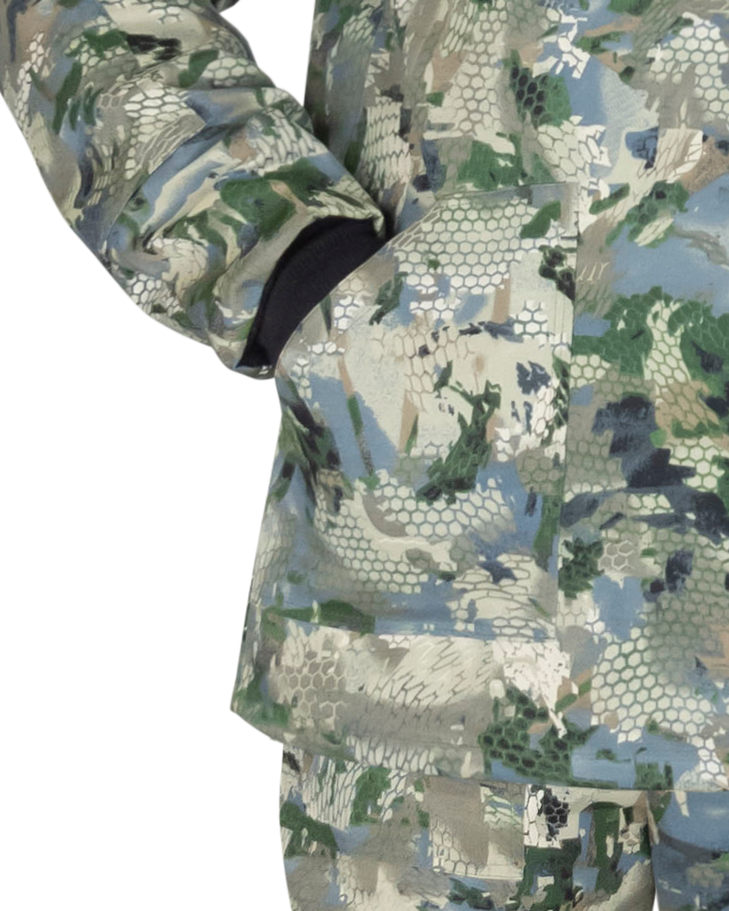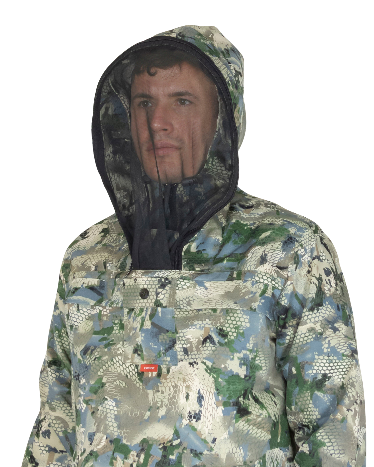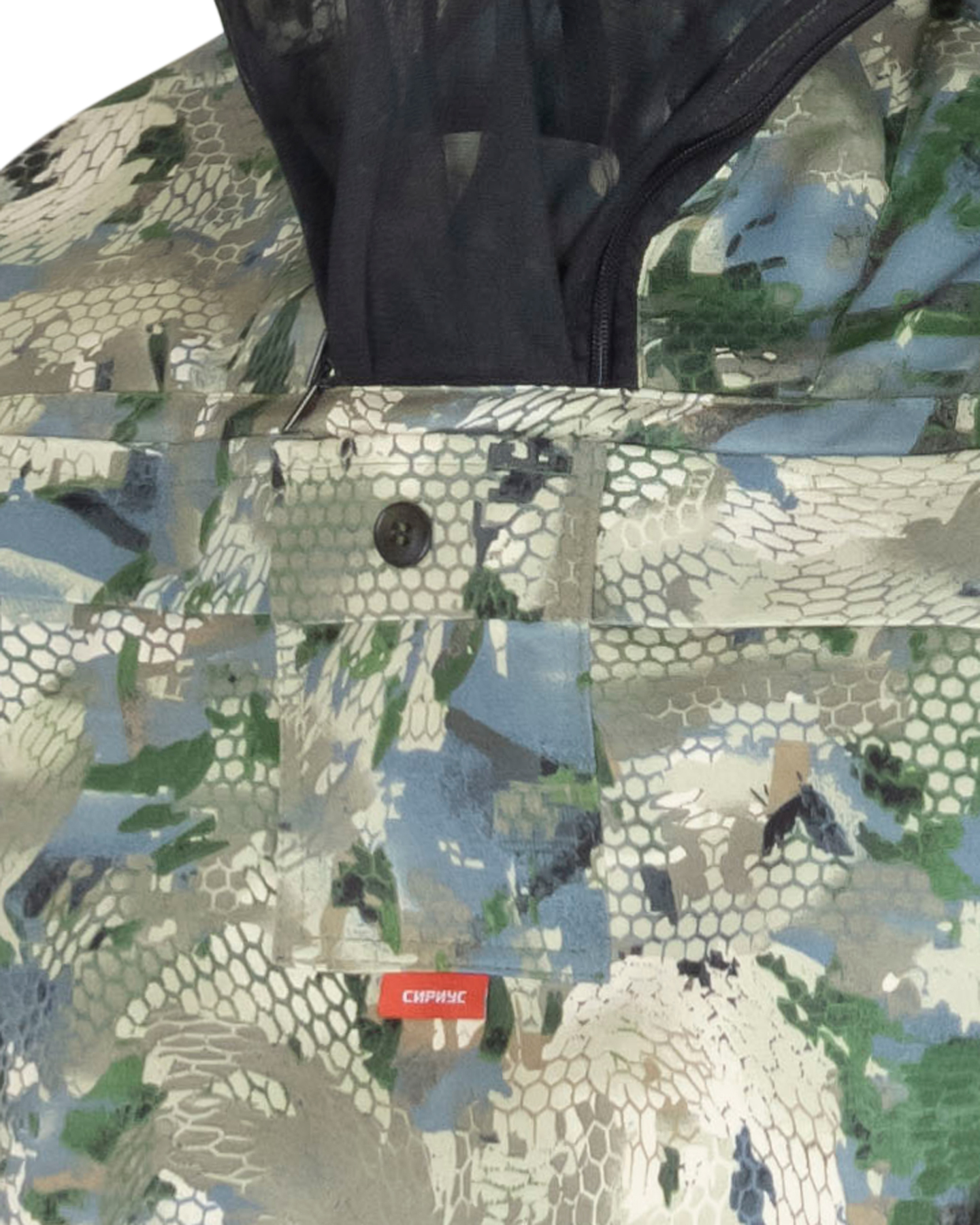 Противомоскитная сетка на молнии по лицевой части капюшона, при необходимости убирается в потайной карман, расположенный в шве кокетки куртки.