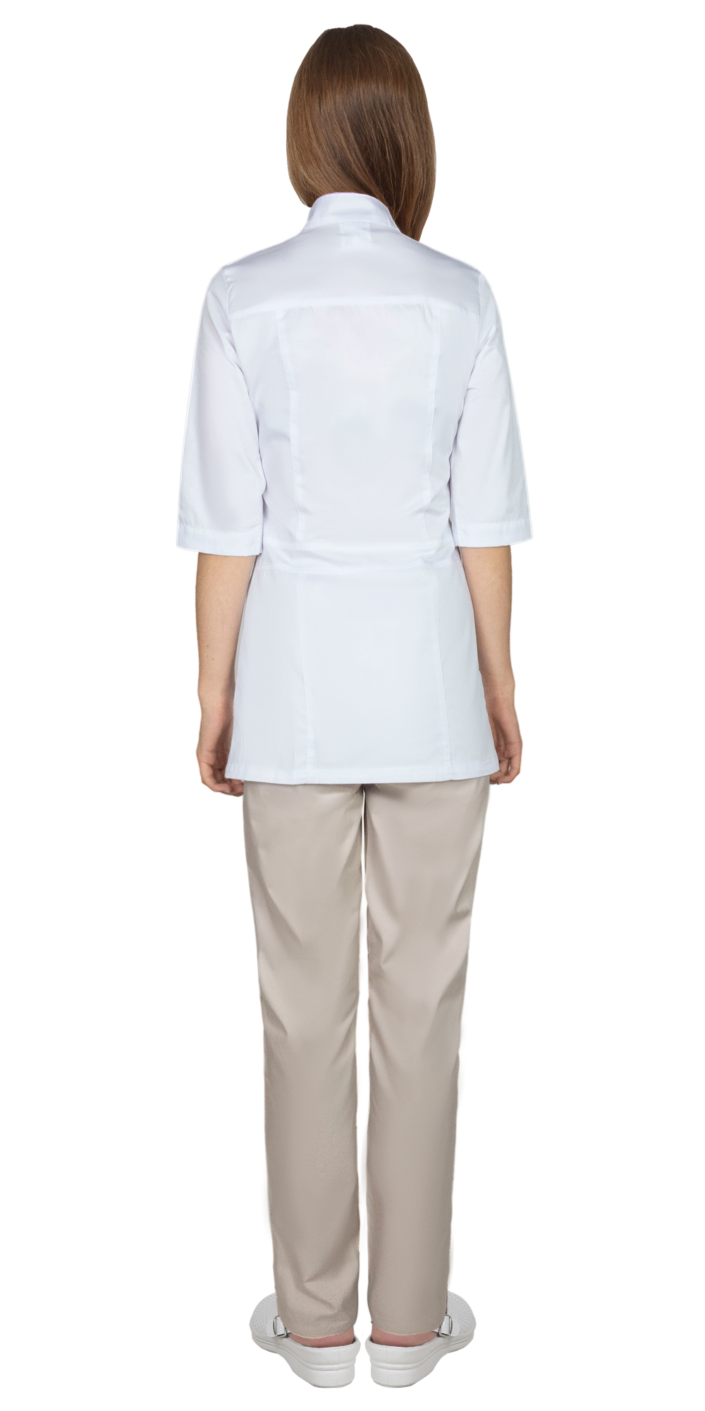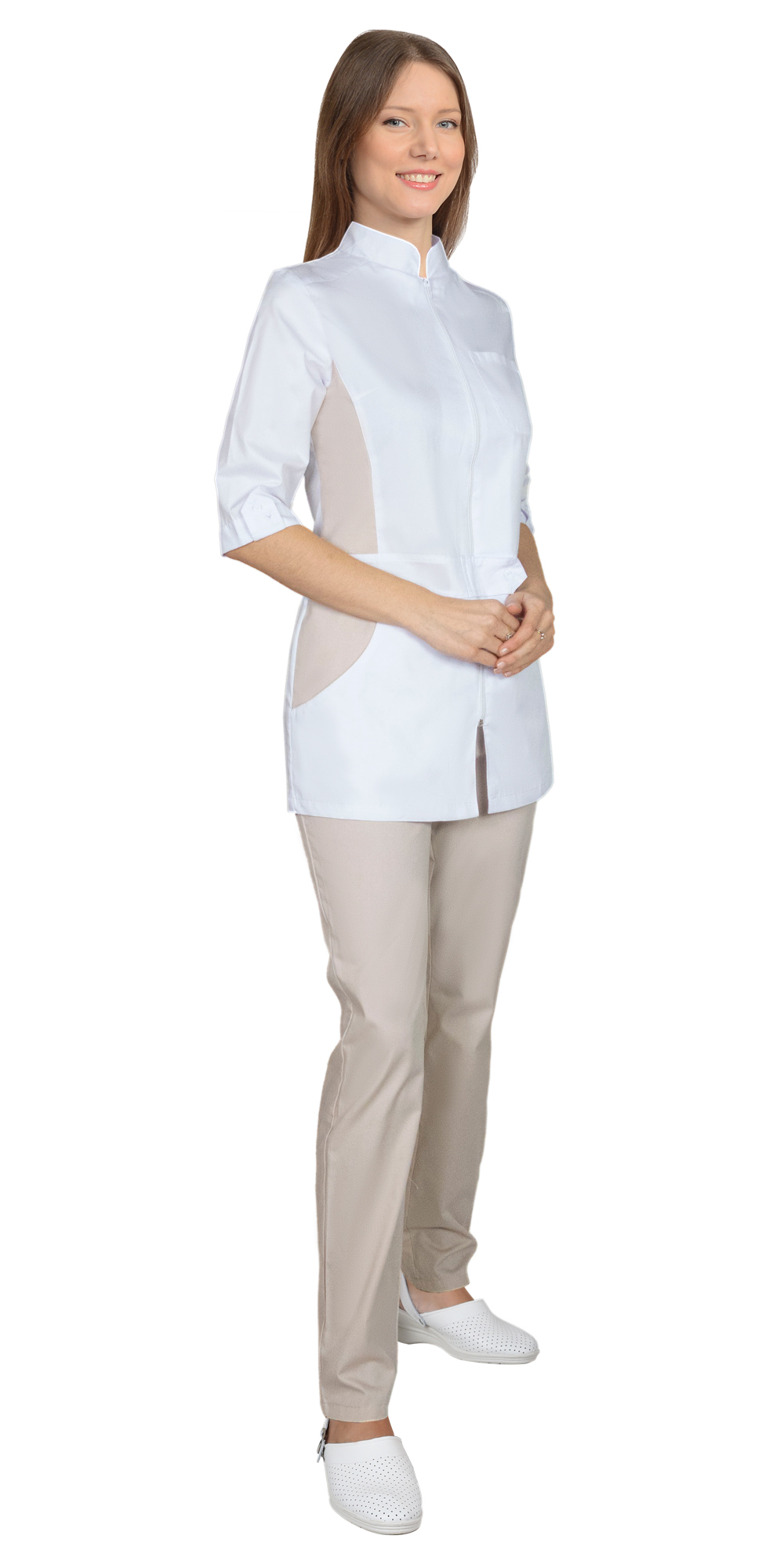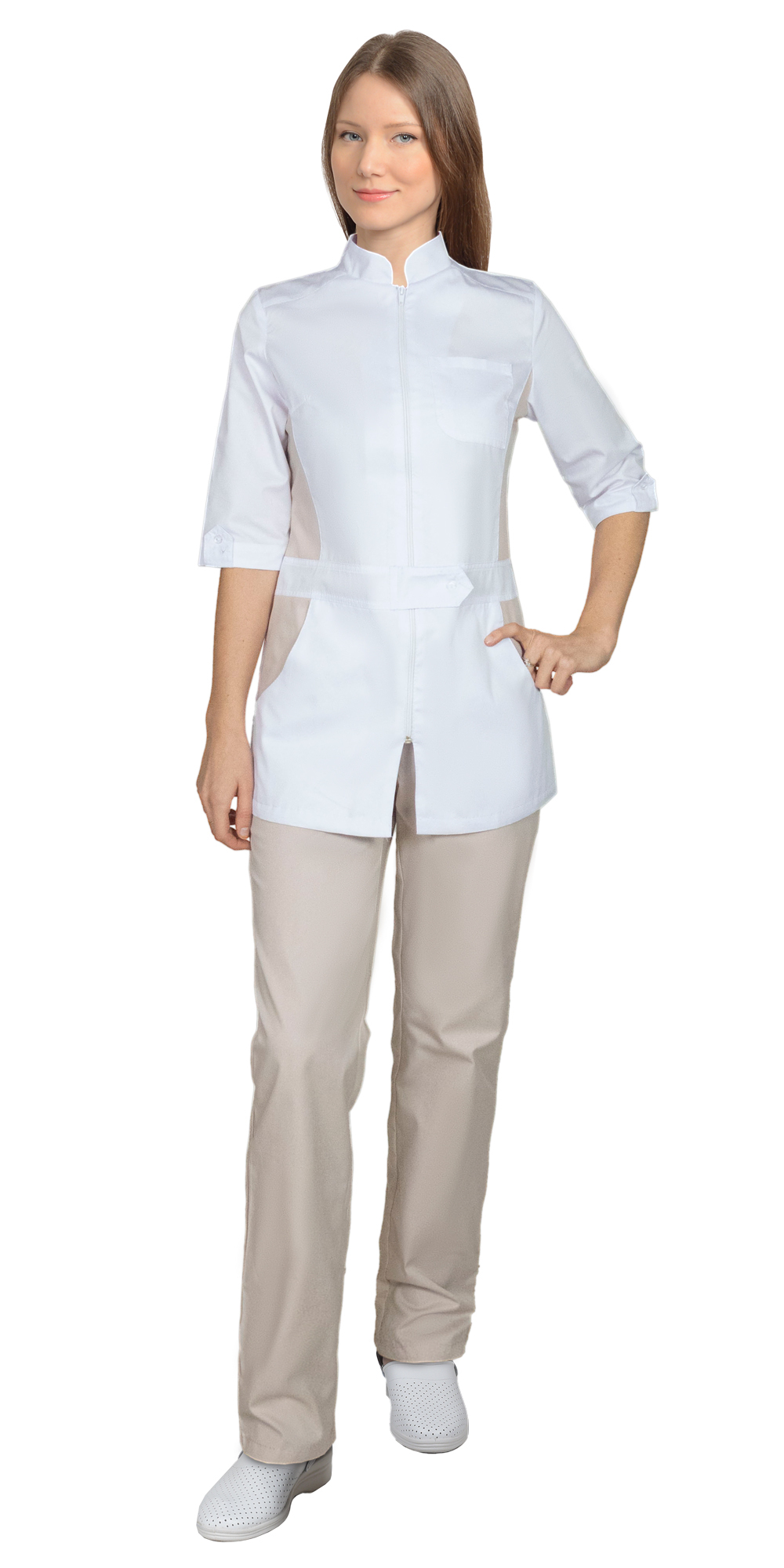 Классическая комбинация белого и бежевого цветов создают нежный и элегантный визуальный эффект. Костюм идеально подойдет для работников медицинской и бьюти сфер.