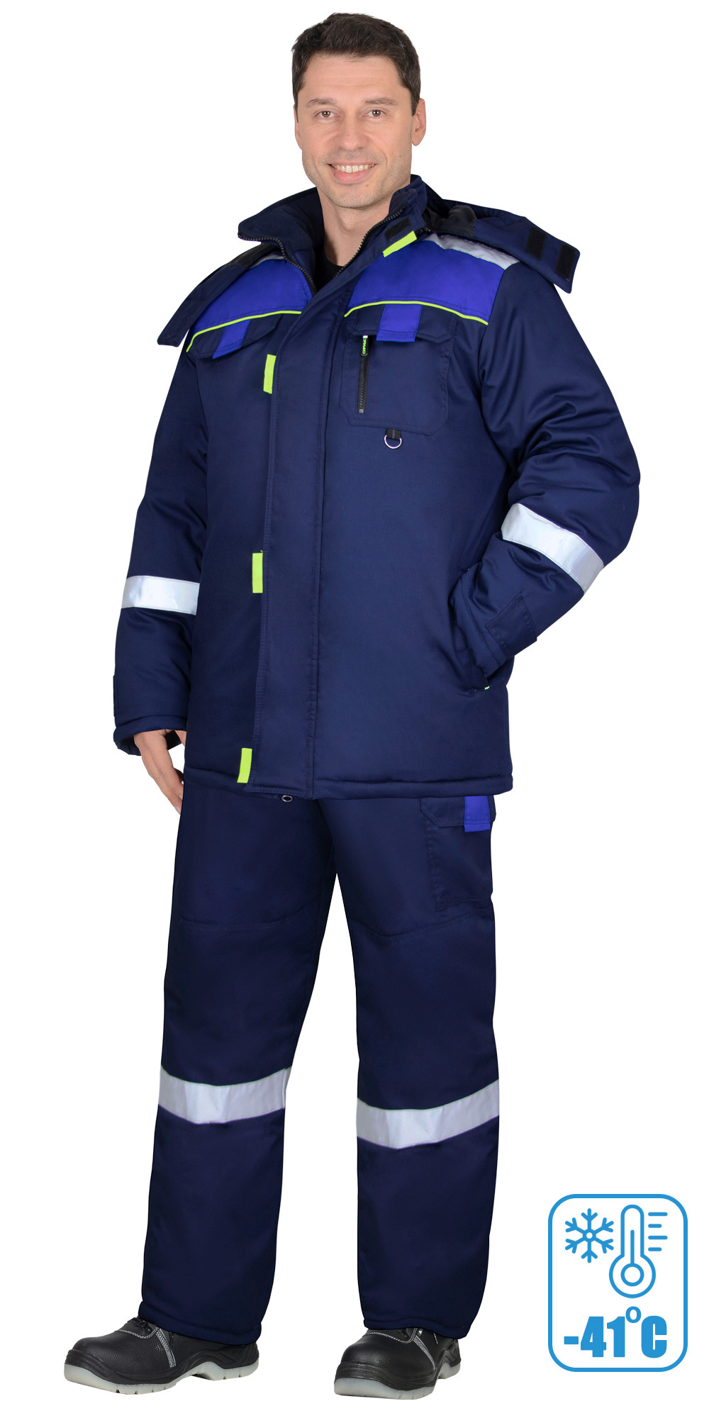 Костюм зимний состоит из куртки и полукомбинезона. В костюме – на куртке и полукомбинезоне предусмотрена лента светоотражающая для обеспечения сигнальной видимости.