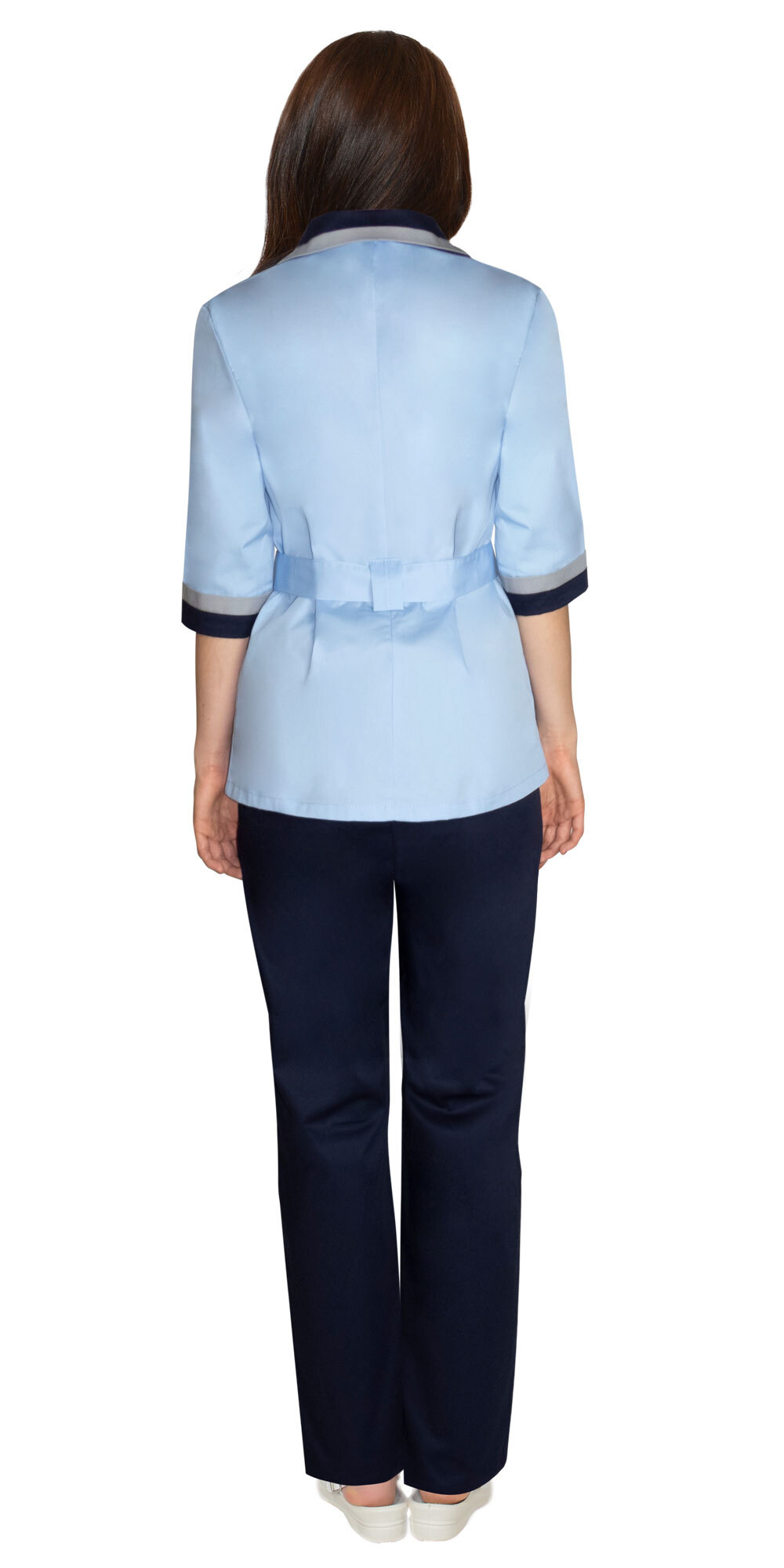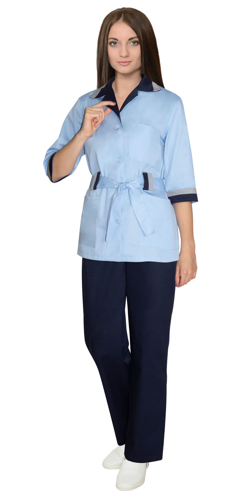 Блуза прямого силуэта с центральной застежкой на пуговицах с отложными лацканами и воротником, с поясом, карманами. Воротник, манжеты, шлёвки из отделочной ткани. Брюки прямые с притачным поясом, частично стянутым резинкой.