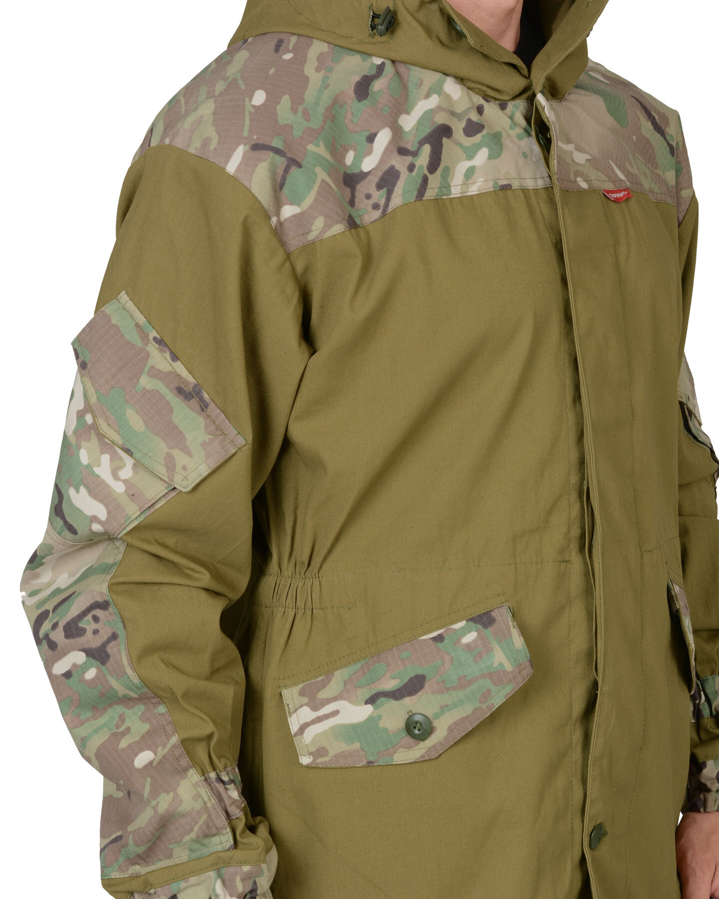 Куртка удлиненная прямого силуэта, с супатной застежкой на пуговицы, с втачным капюшоном с козырьком, с усилительными накладками, с прорезными карманами листочка и фигурными клапанами на пуговицу, с внутренним карманом. Рукава с накладными полуобъёмными карманами и фигурными клапанами на липучку, с манжетами частично стянутыми резинкой. Куртка по линии талии частично стянута резинкой, по низу куртка регулируется шнуром.