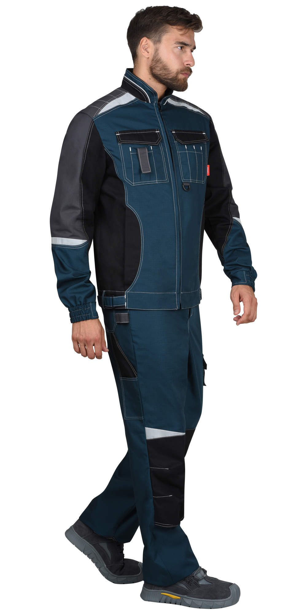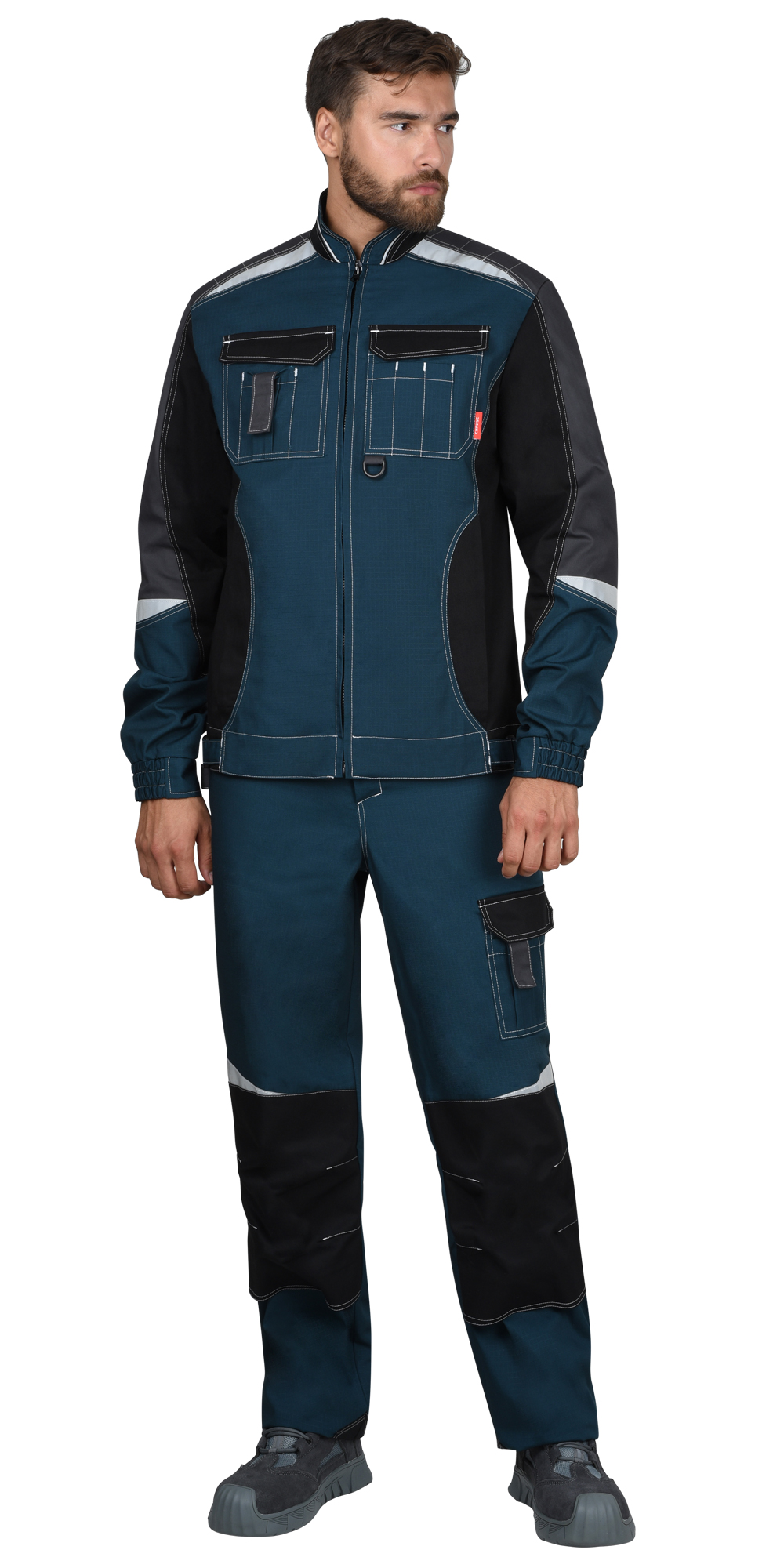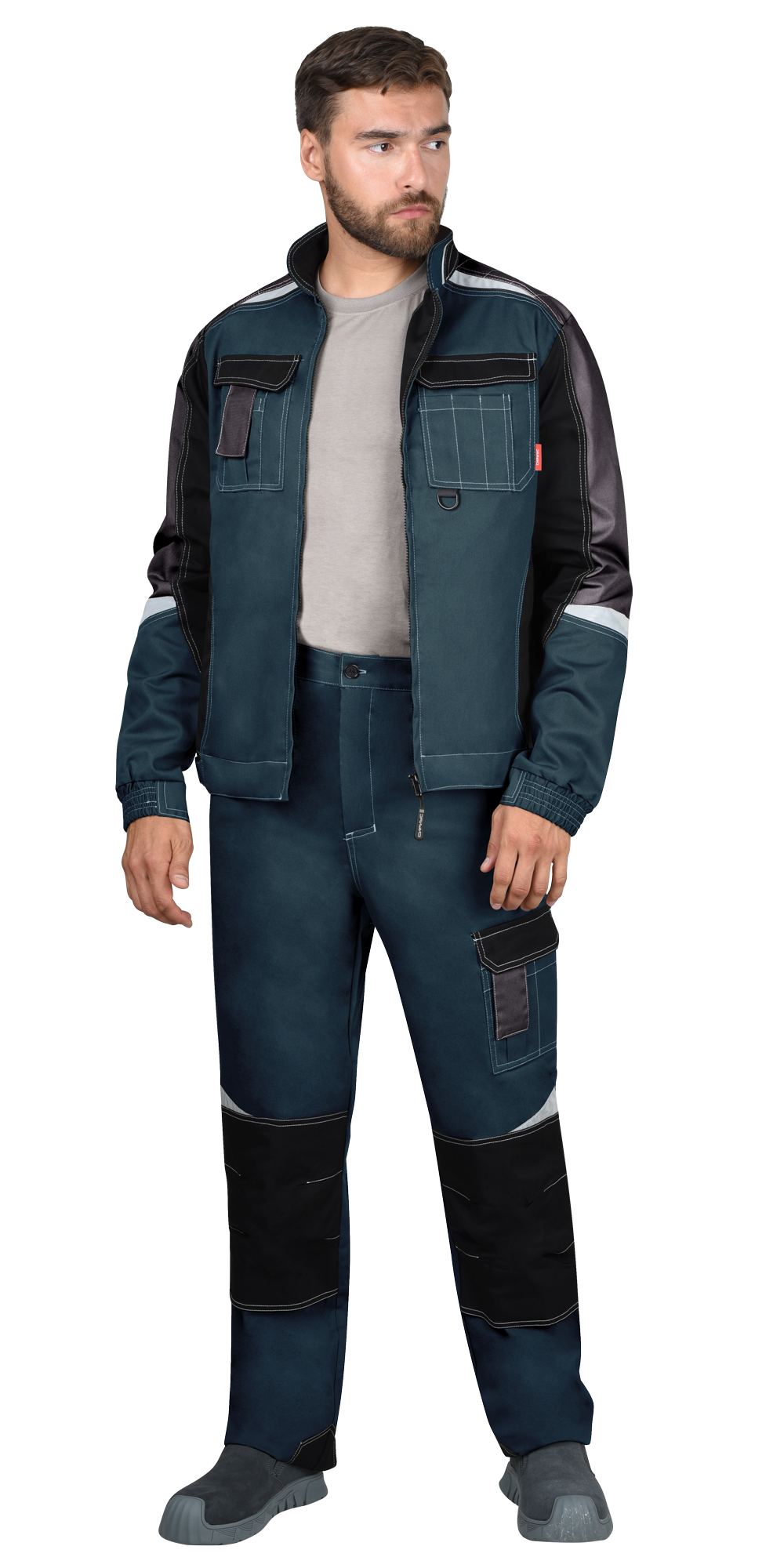Брюки с застёжкой спереди – гульфик с молнией, с отрезным поясом, застегивается на пуговицу, с боковыми внутренними карманами на передних половинках, с накладными карманами на правой задней половинке и на левом боковом шве. Брюки с объемными наколенниками с нижним входом для амортизационного вкладыша. В брюках предусмотрены светоотражающие элементы, для обозначения сигнальной видимости.