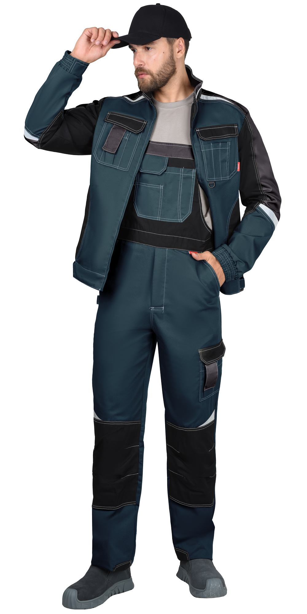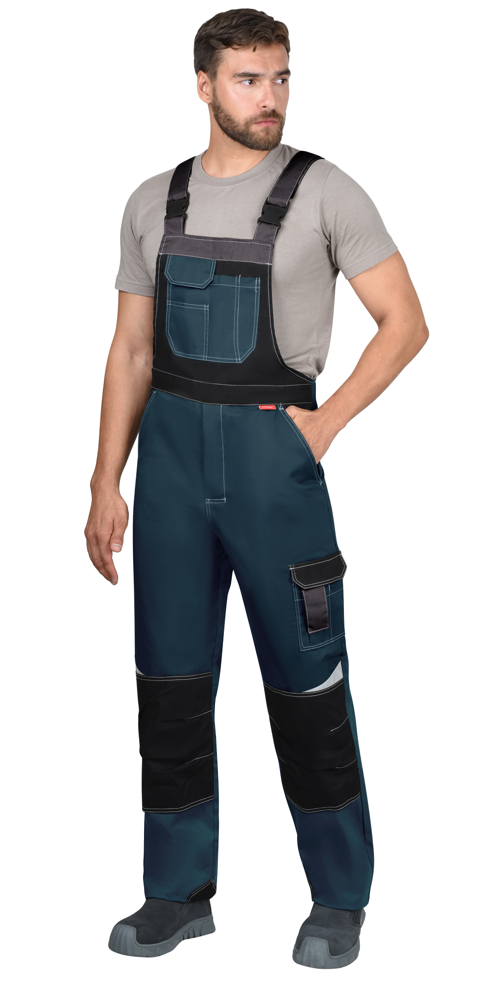 Полукомбинезон прямой с застёжкой спереди - гульфик с молнией и с застёжкой в правом боковом шве на пуговицы, с отрезной грудкой, с бретелями, с боковыми внутренними карманами на передних половинках, с накладными карманами на правой задней половинке и на левом боковом шве. Полукомбинезон с объемными наколенниками с нижним входом для амортизационного вкладыша. Бретели регулируются при помощи застежек-фастексов и резинки. В полукомбинезоне предусмотрены светоотражающие элементы, для обозначения сигнальной видимости.