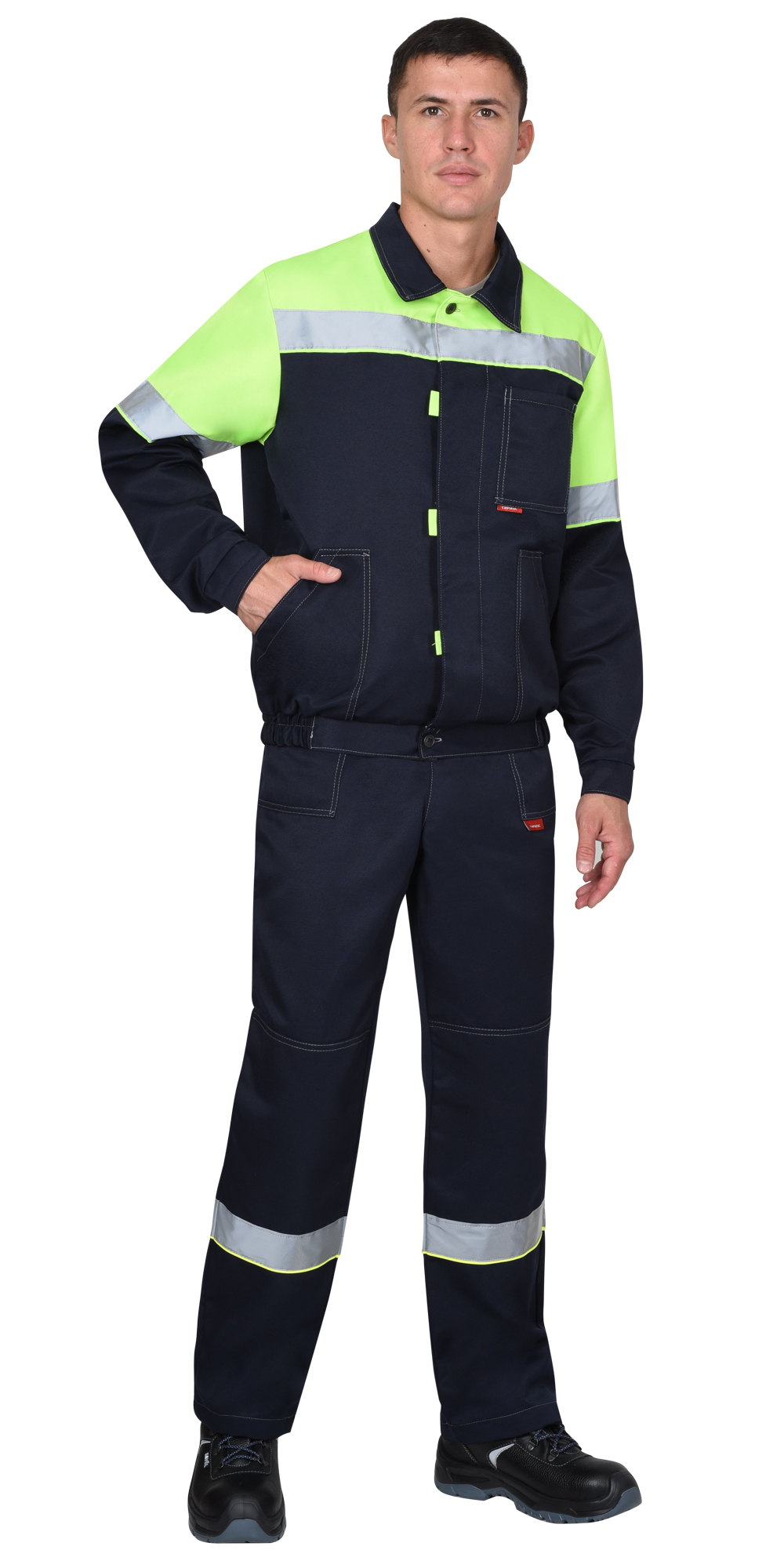 Куртка, укороченная, прямого силуэта, на поясе. Куртка с центральной потайной застёжкой на пуговицы, с отложным воротником, с одним нагрудным и двумя нижними карманами, с втачными рукавами с манжетой на пуговице. В куртке предусмотрено крепление для бейджа и лента светоотражающая ш.50 мм для сигнальной видимости.