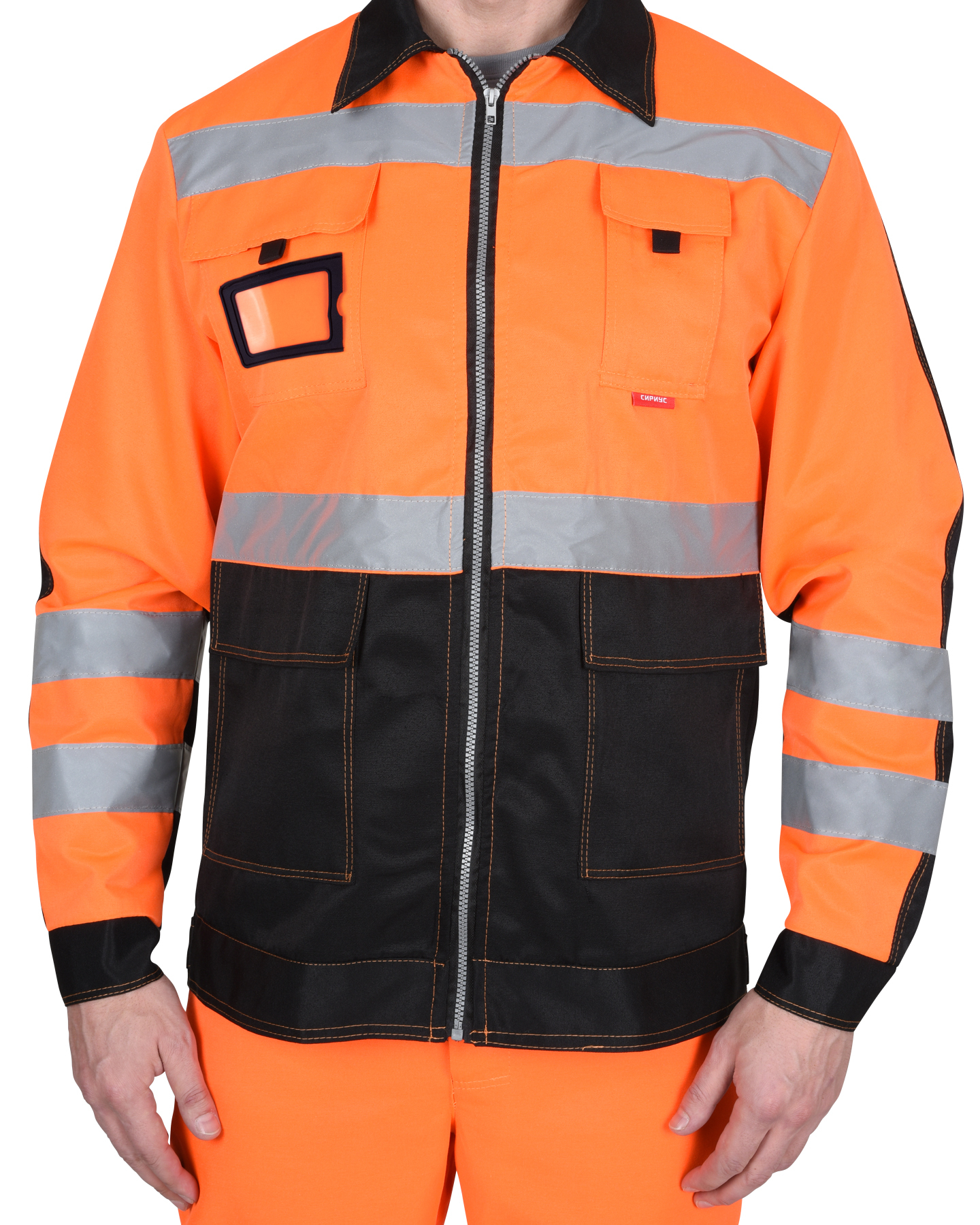Куртка с центральной застежкой молния, отложным воротником, отрезным поясом по низу изделия, втачными рукавами с манжетами, верхними и нижними накладными карманами с клапаном и прозрачным карманом для бейджа. Объём по низу куртки регулируется со стороны спинки хлястиками с кнопками. Впереди на куртке лента светоотражающая шириной 50 мм в 2 ряда – по линии гуди и по линии талии, сзади – лента светоотражающая шириной 50 мм – 2 вертикальные полосы в верхней части и по линии талии, по низу рукавов – лента светоотражающая шириной 50 мм в 2 ряда.