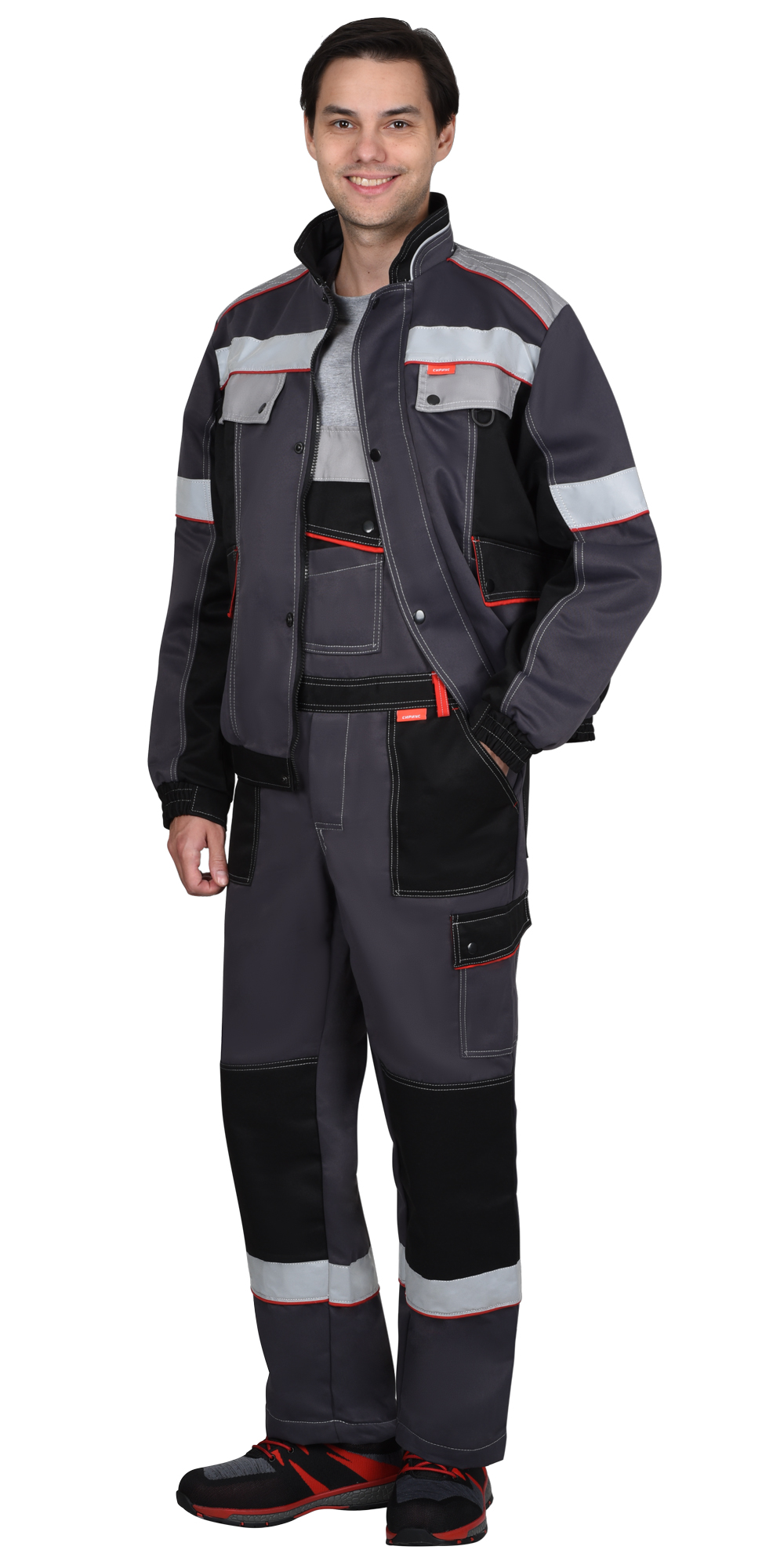 Для обеспечения видимости в темное время суток в костюме предусмотрена лента светоотражающая.