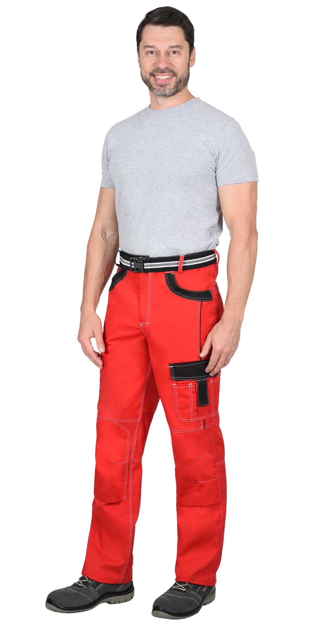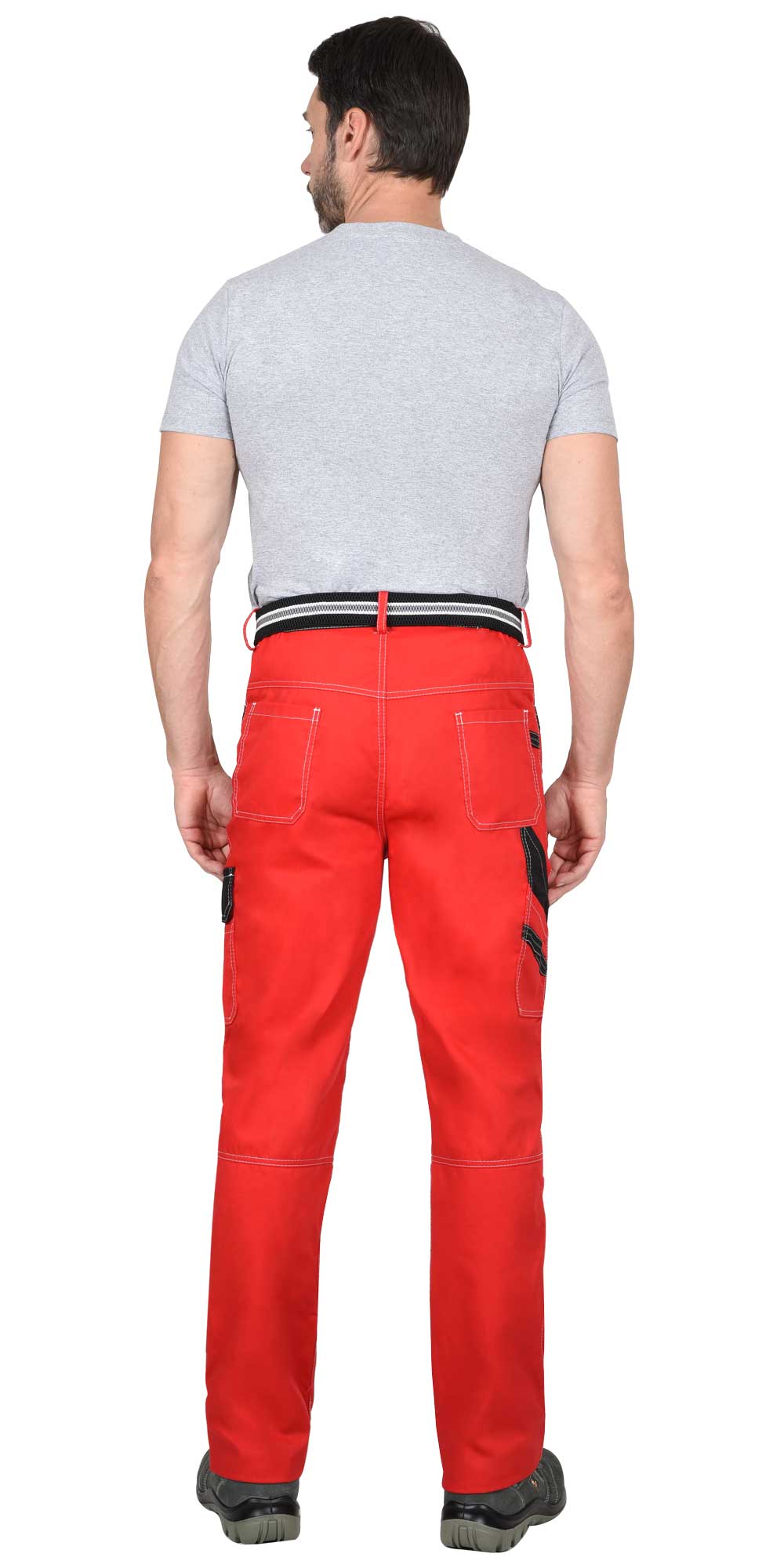 Брюки прямые, на притачном поясе, с застёжкой гульфика на молнию, с боковыми внутренними карманами, с часовым карманом; на задних половинках с отрезной кокеткой, двумя накладными карманами и карманами под инструменты. В брюках предусмотрен ремень из резинки помочной декорированной застегивающийся на защелку – фастекс.
