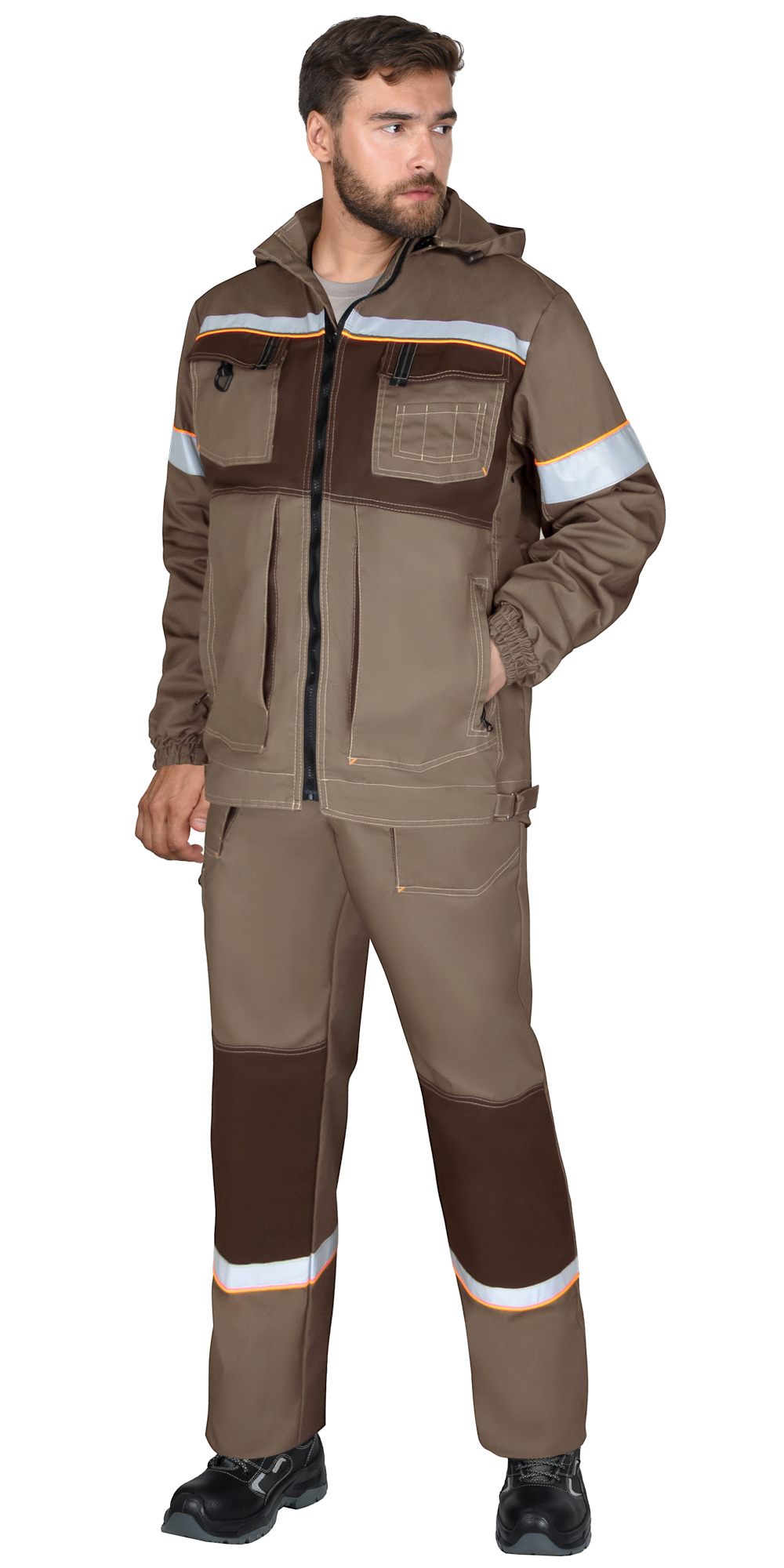 Брюки прямого силуэта, на притачном поясе со вставками эластичной ленты в области боковых швов, с застёжкой на молнию – гульфик. Передние половинки брюк с боковыми объемными карманами, на задних половинках два накладных кармана, на правом боковом шве накладной карман на молнии, на передних половинках в области коленей усилительные накладки. На поясе брюк пять шлевок.