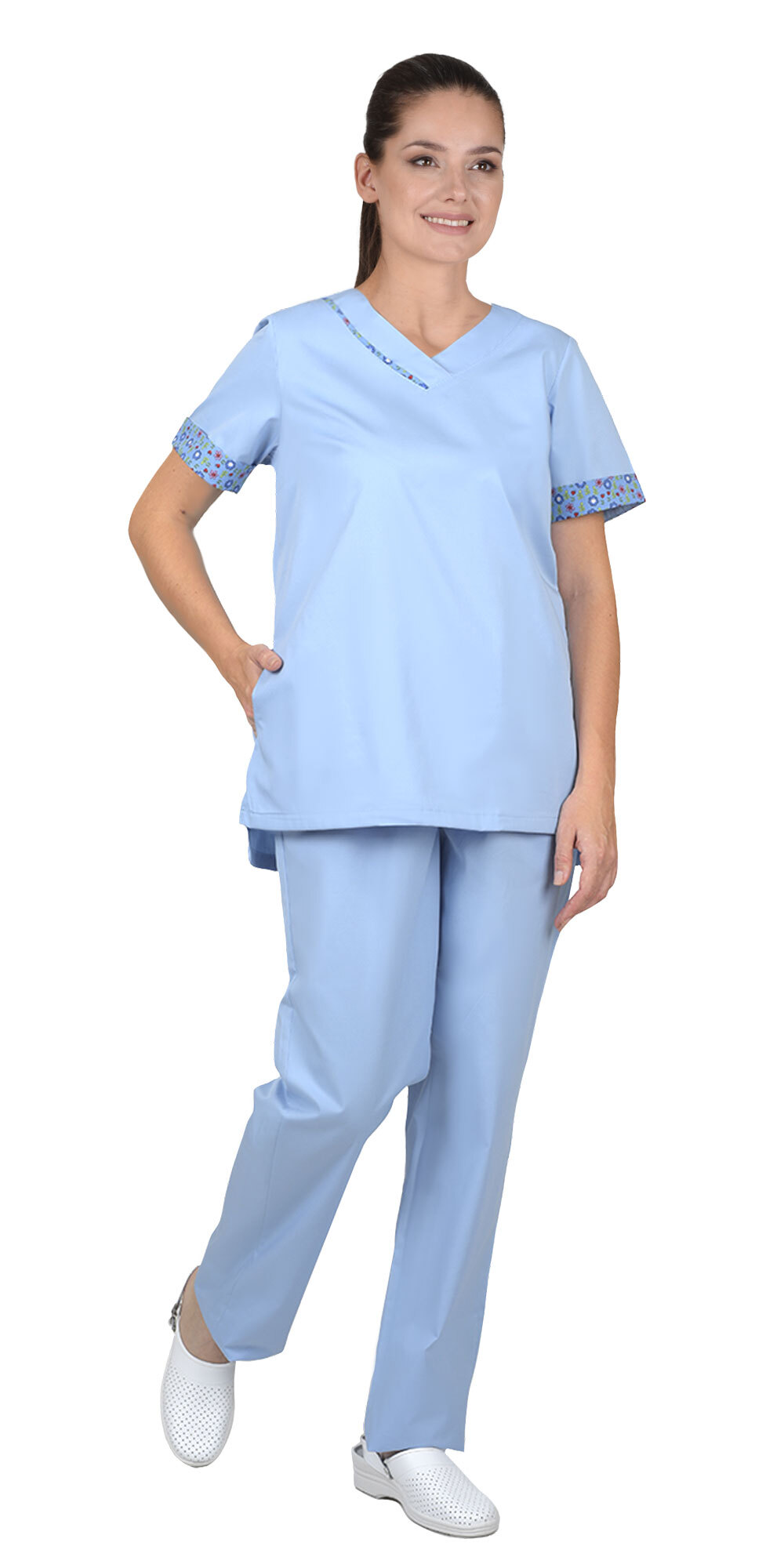 Костюм женский состоит из блузы и брюк. Блуза полуприлегающего силуэта с короткими рукавами, без застёжки. V – образный вырез горловины. С карманами в боковых швах. Спинка по линии низа длиннее полочки, по боковым швам разрезы. Горловина спинки, отложной манжет и внутренняя боковина карманов выполнены из контрастной ткани. Брюки прямые на притачном поясе без застежки. Два боковых кармана с бочками из контрастной ткани.