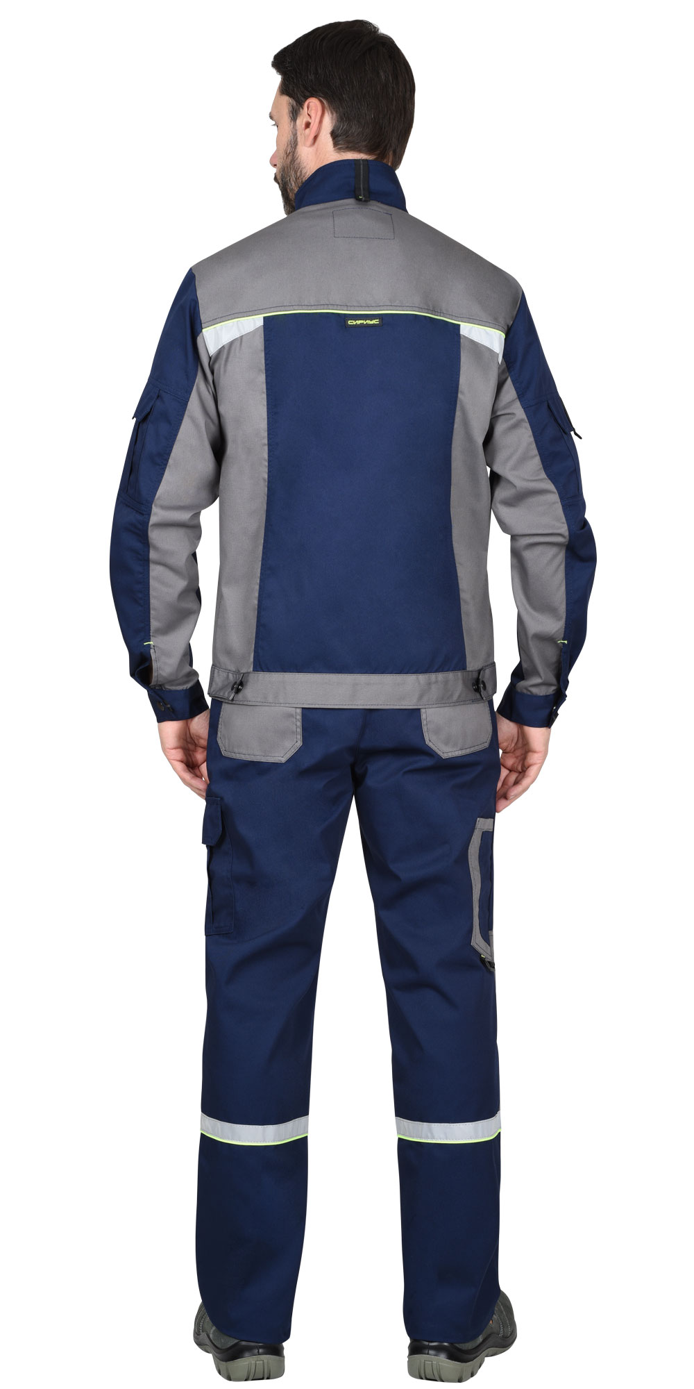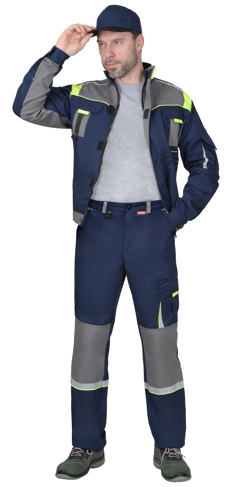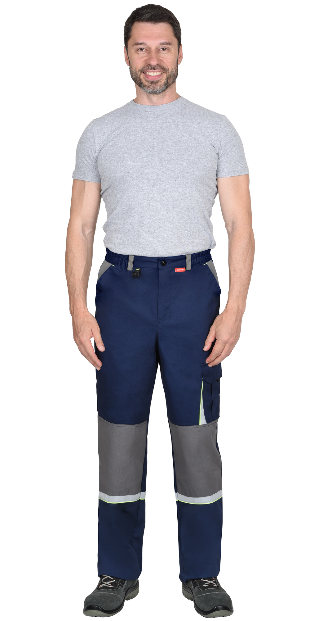 Брюки прямые, с застёжкой спереди на молнию, с отрезным поясом, с частичной стяжкой на резинку по бокам и застёжкой на пуговицу, со шлевками, с внутренними боковыми карманами, с наколенниками, с накладным карманом с клапаном на липучке на левом боковом шве, с задними накладными карманами и карманами для инструментов. Брюки со светоотражающими элементами.