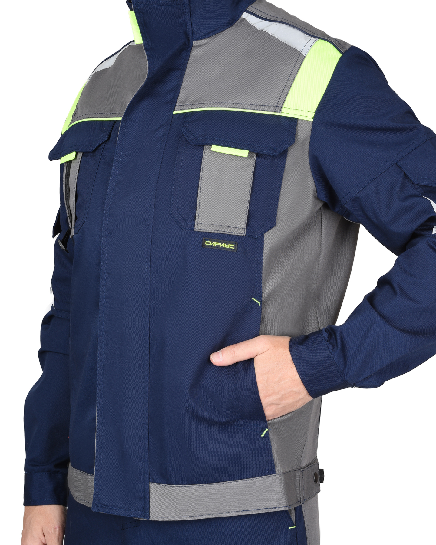 Куртка прямого силуэта, короткая, с воротником стойка, центральной застёжкой на молнию до верха воротника, накрытой ветрозащитным клапаном с застёжкой на кнопку и липучки, верхними накладными карманами с клапаном, нижними карманами в рельефных швах. Куртка с отрезным поясом, регулируется при помощи хлястиков с кнопками. Рукава с манжетами с кнопками, карманами с клапанами с застежкой на липучку. Плечевые швы смещены на полочки. Куртка спереди и сзади со светоотражающими элементами. В куртке предусмотрено крепление бейджа.