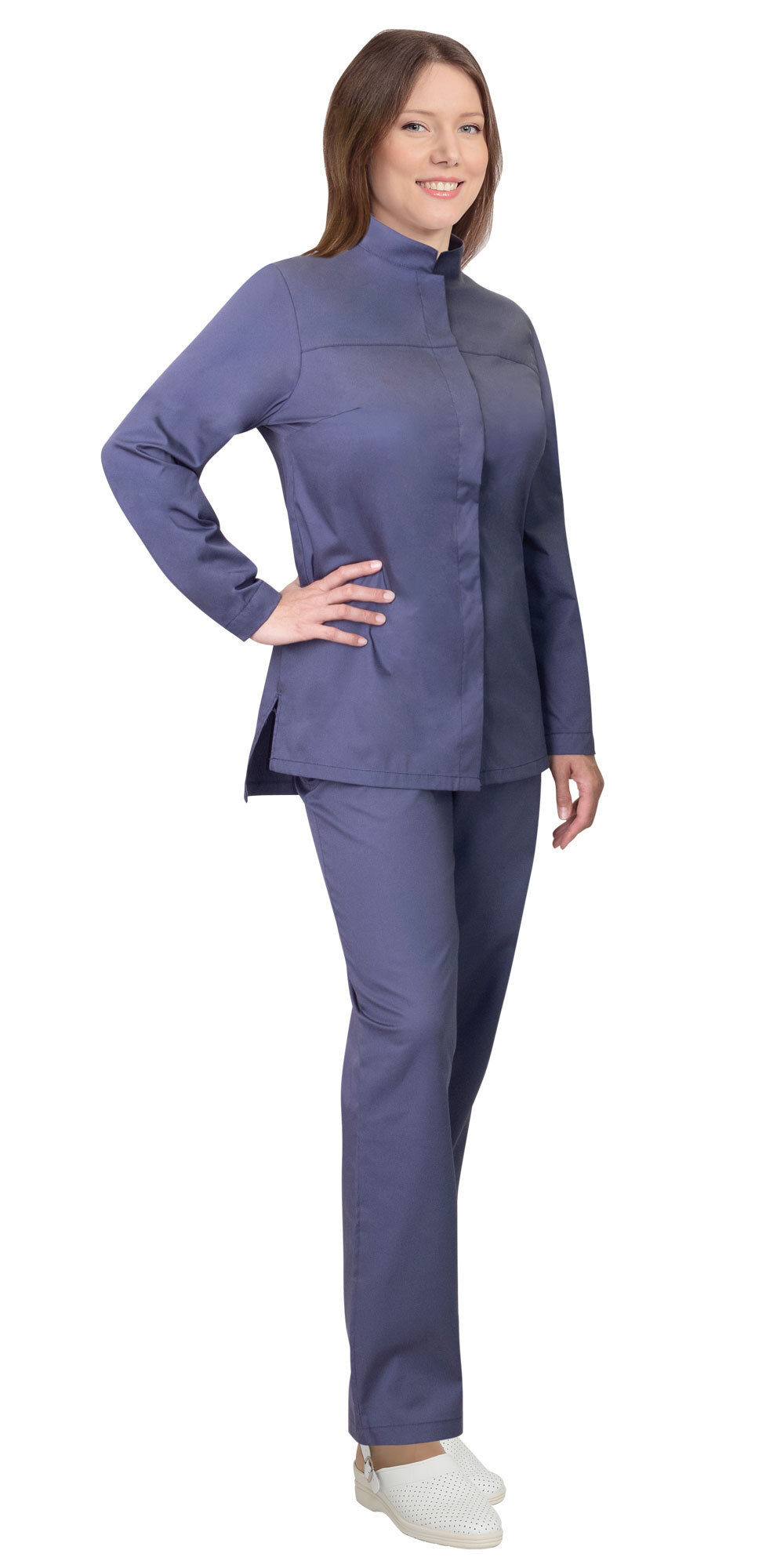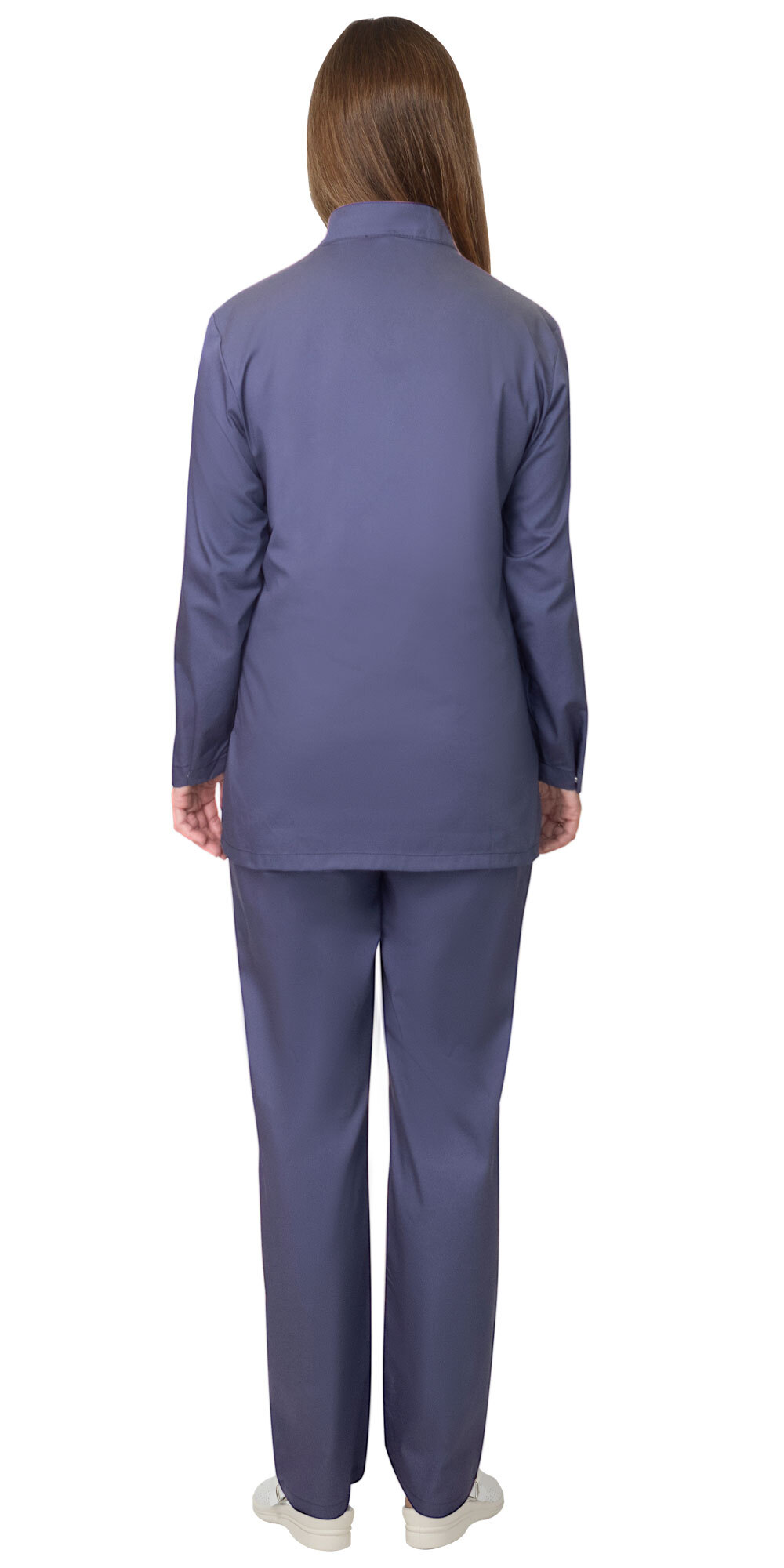 Куртка с длинными рукавами прямого силуэта с центральной застежкой на потайные кнопки с втачным отложным воротником. Внутренний карман. В низу боковых швов небольшие разрезы для удобства движения. Брюки прямые на притачном поясе, частично стянутом на резинку. По шву притачивания пояса спереди с правой стороны расположен потайной карман на липучке.