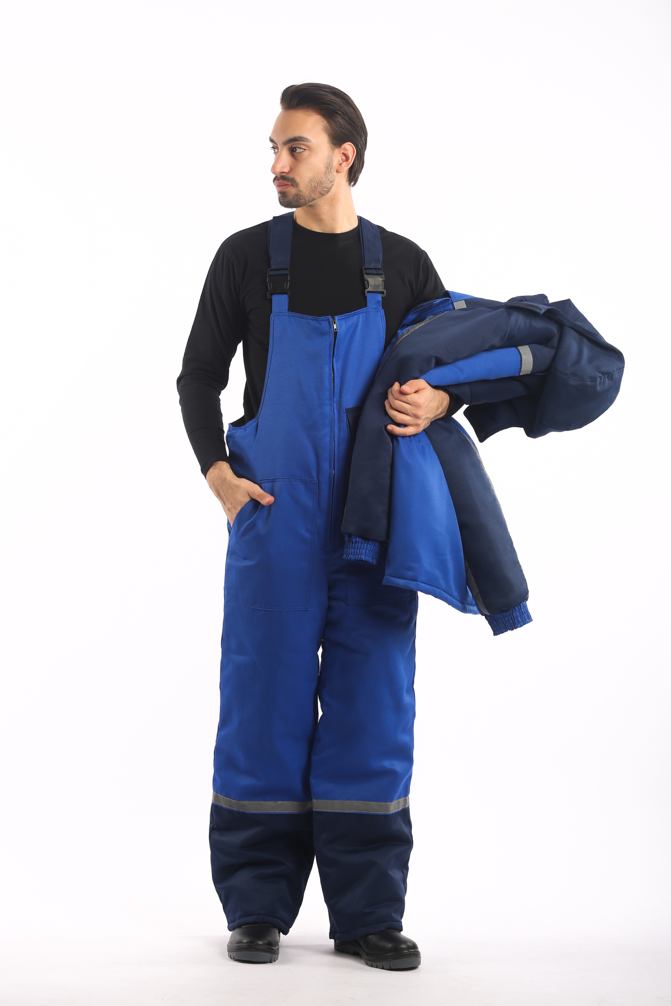 Полукомбинезон - прямой, с притачной утеплённой подкладкой, с регулируемыми по длине, при помощи пряжек – фастексов, бретелями; с притачным нагрудником; с центральной застёжкой на двухзамковую тесьму - «молния»; с нагрудными накладными карманами, с двумя боковыми внутренними карманами, с двумя накладными карманами на боковых швах, с фигурным клапаном.