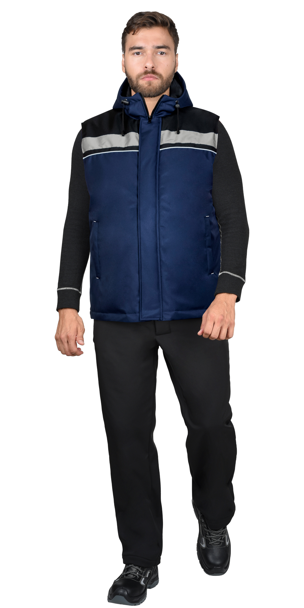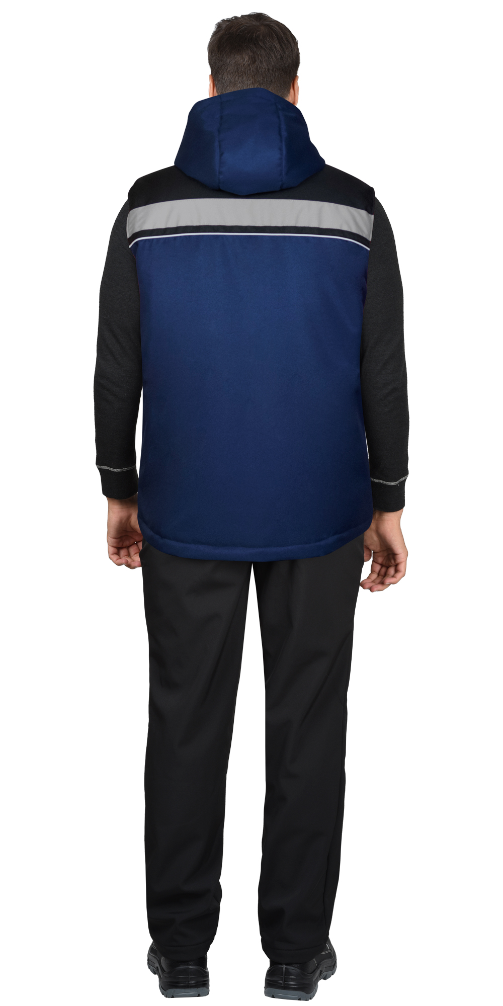 Жилет утеплённый, прямого силуэта, на подкладке, с втачным капюшоном, центральной застёжкой на молнию от края капюшона до низа изделия, накрытую ветрозащитным клапаном с липучками, прорезными карманами с листочкой. Спинка жилета, удлинённая с фигурной линией низа. Объём капюшона по лицевому вырезу регулируется шнуром с фиксаторами. На левой полочке подкладки жилета накладной карман с молнией. В жилете предусмотрена светоотражающая полоса для обеспечения видимости в любое время суток. Жилет может использоваться как для активного отдыха, так и для работы в неотапливаемых помещениях или на открытом воздухе в осенне-зимний период. Удобный крой не затрудняет движений.