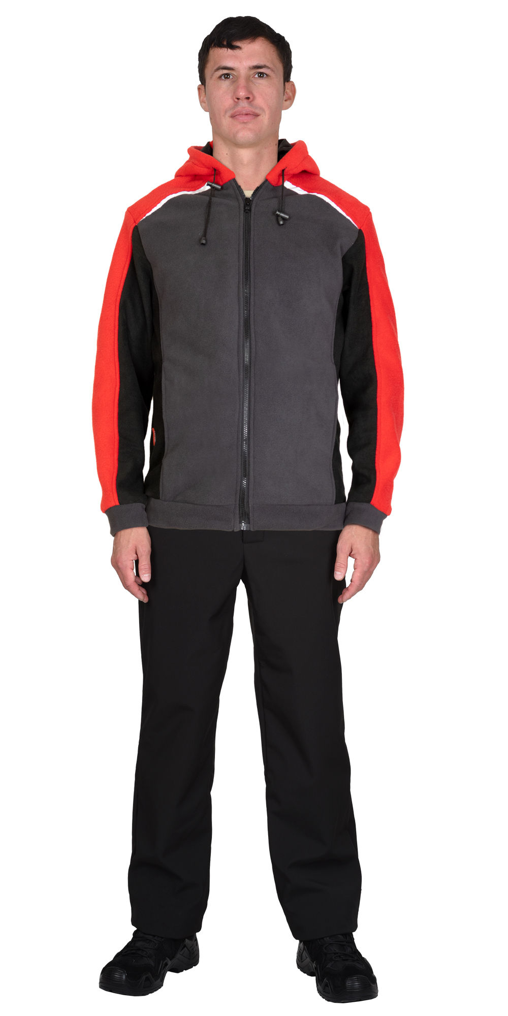 Куртка из флиса, прямого силуэта, с втачным капюшоном, центральной застежкой «молния» от горловины до низа, карманами в шве, втачными рукавами с манжетой, поясом по низу.