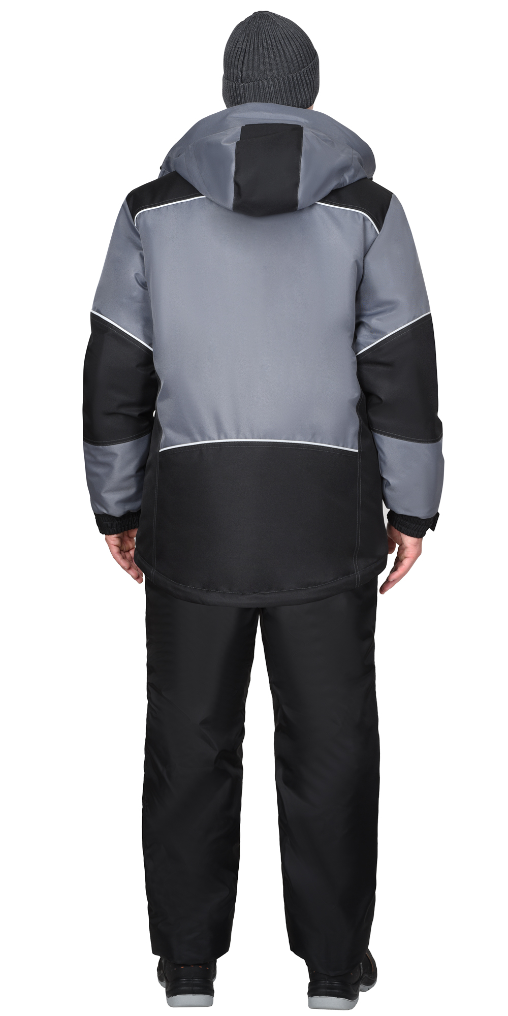 Куртка прямого силуэта, с фигурной удлиненной линией низа спинки, на утеплённой подкладке. Куртка с втачным капюшоном, с центральной застежкой на молнию до верха капюшона, накрытую фигурным ветрозащитным клапаном, состоящим из двух частей, застегивается на потайные кнопки, с внутренней планкой по правому борту, с верхними и нижними карманами с молнией. Рукава с манжетами, частично стянутыми резинкой, с внутренними трикотажными напульсниками. Подкладка куртки с ветрозащитной юбкой. Объём куртки понизу регулируется при помощи шнура и фиксаторов. В куртке предусмотрено крепление бейджа.