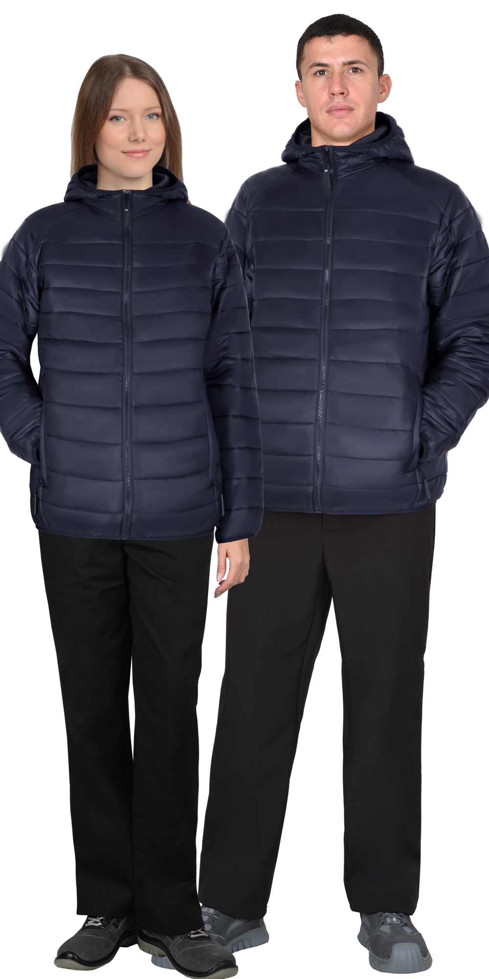 Куртка, утепленная из стёганного полотна, с центральной бортовой застёжкой молния, с втачным капюшоном, с общей кокеткой полочек и спинки, с втачными рукавами, с карманами на молнии в шве рельефа, с удлинённой фигурной линией низа на спинке. Низ куртки, низ рукавов и лицевой вырез капюшона окантованы эластичной тесьмой.