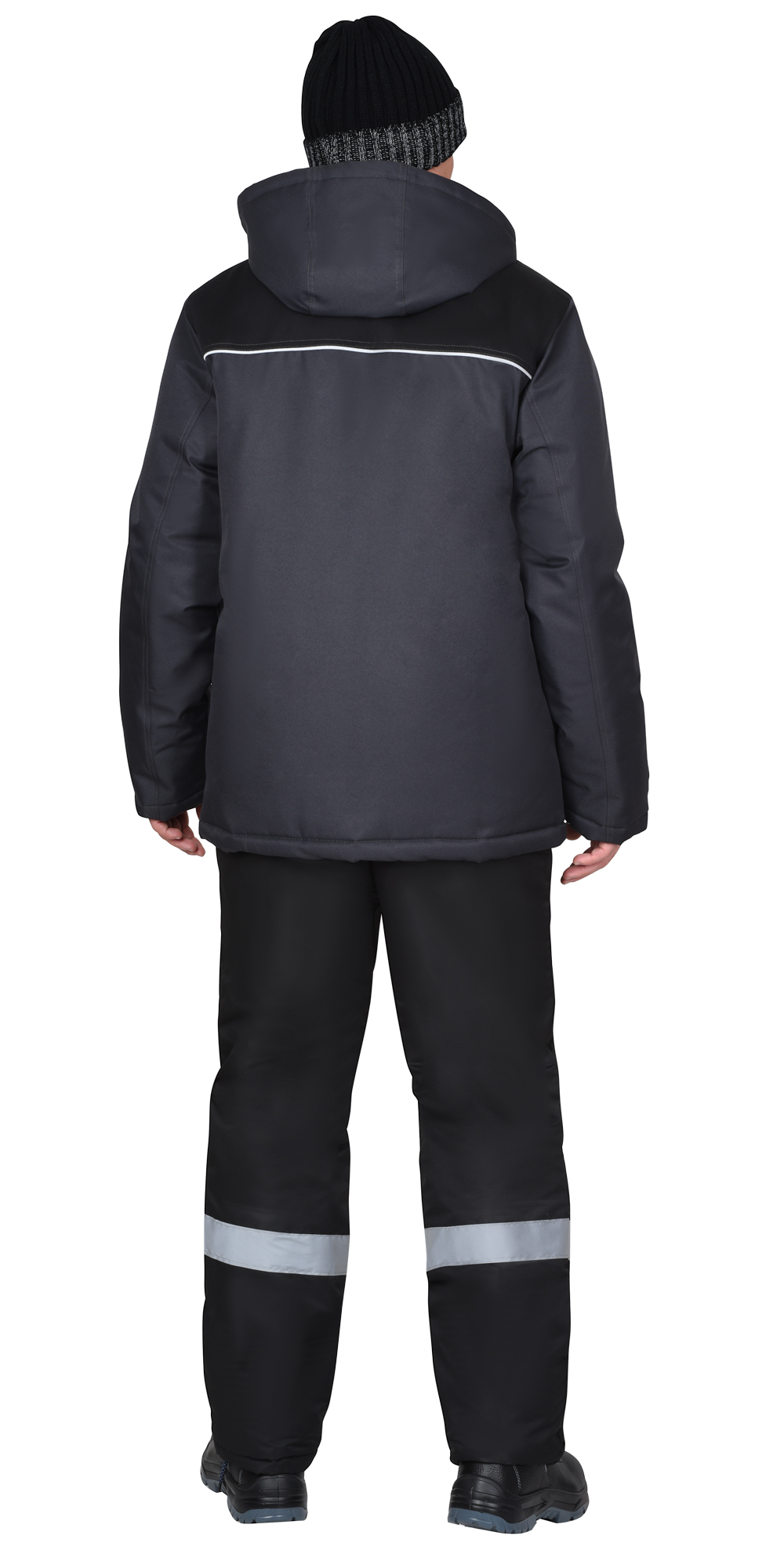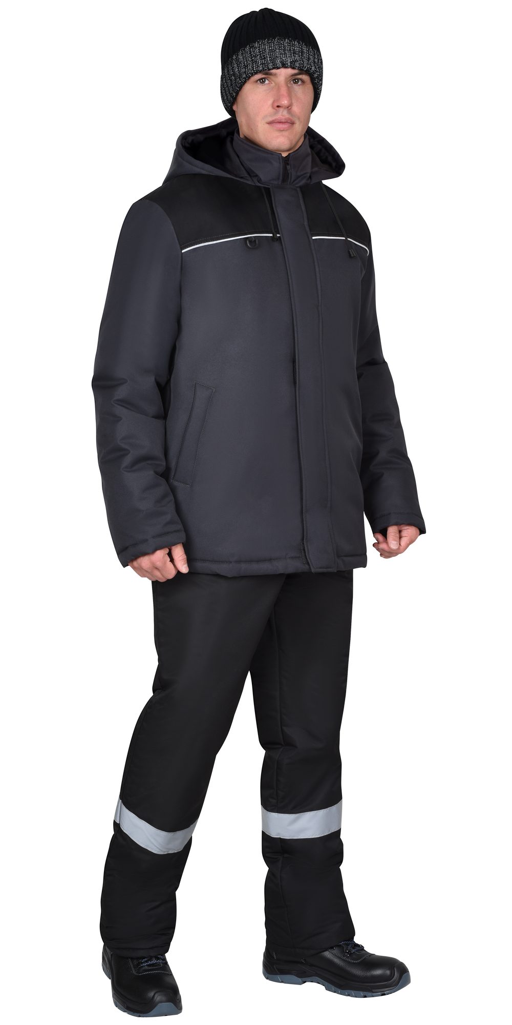 Куртка прямого силуэта, удлинённая, с креплением для бейджа, с втачным капюшоном и воротником стойка, с центральной застёжкой на молнию от края воротника до низа куртки, накрытую ветрозащитным клапаном с потайными липучками. Куртка с нижними прорезными карманами с листочками. Рукава втачные с внутренними трикотажными манжетами. Подкладка куртки утепленная, с внутренним карманом, застегивающимся на липучку. В куртке предусмотрен СВ-кант, для обеспечения сигнальной видимости.