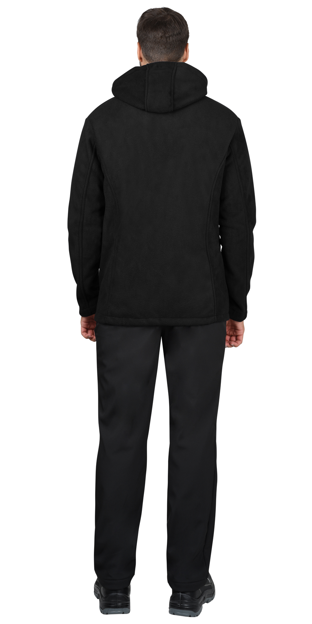 Куртка из дублированного флиса, без подкладки, прямого силуэта, с втачным капюшоном, с центральной, бортовой застёжкой на молнию от лицевого выреза капюшона до низа изделия. Полочка с отрезной кокеткой, бочком и карманом на молнию в рельефном шве. Рукава втачные, двухшовные.