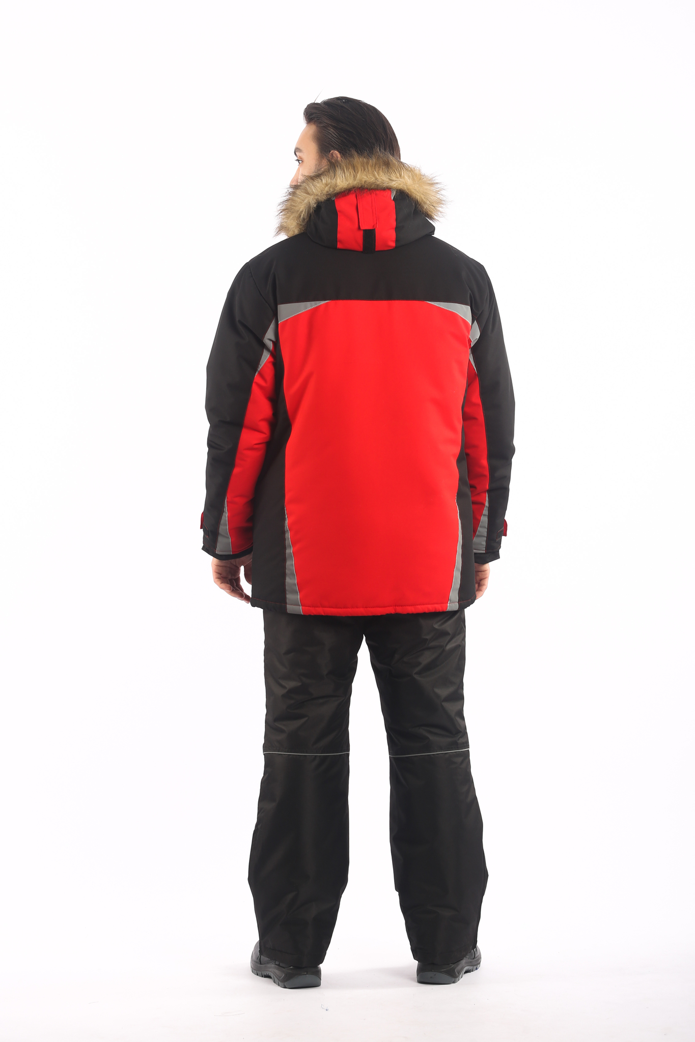Куртка комбинированная из ткани двух цветов, с центральной застежкой на молнию, с удлиненной фигурной линией низа по спинке, с втачным капюшоном, с втачными рукавами. На подкладке с правой стороны накладной карман на молнию.