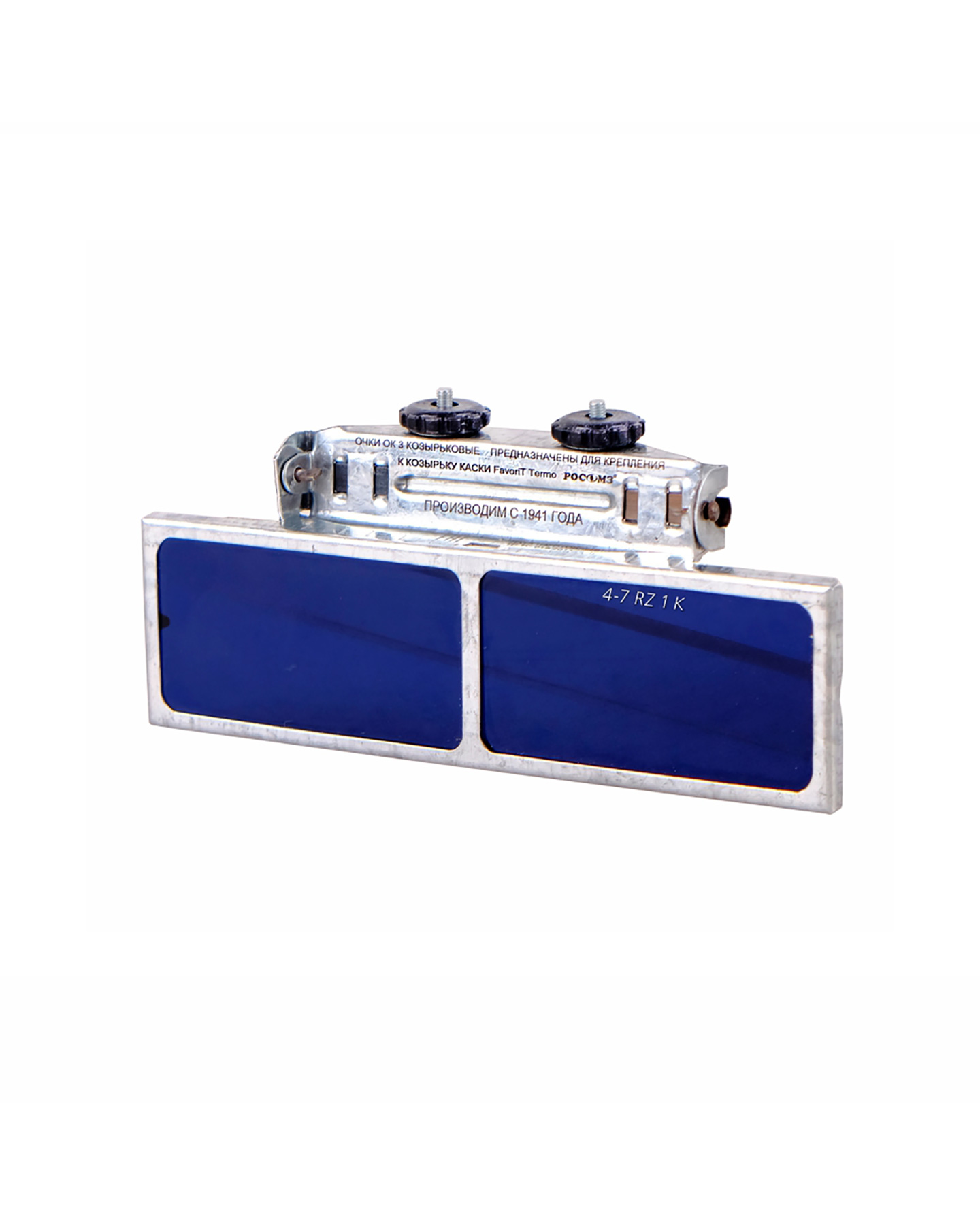 Очки козырьковые с минеральными защитными стеклами-светофильтрами в жестком металлическом стеклодержателем с поворотно-фиксирующим устройством и кронштейном для крепления на защитный головной убор или лицевой щиток. Крепятся только снаружи экрана щитка защитного.