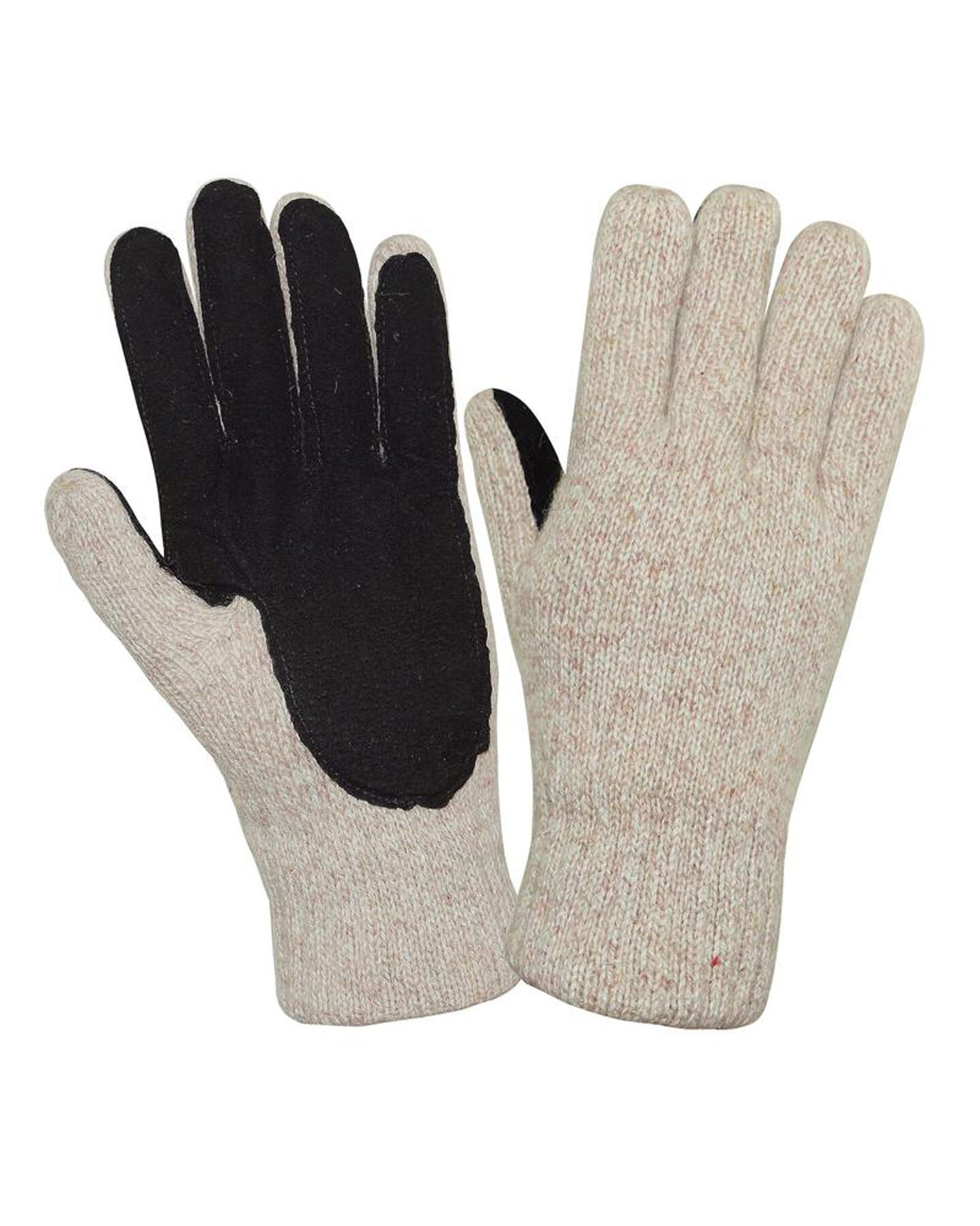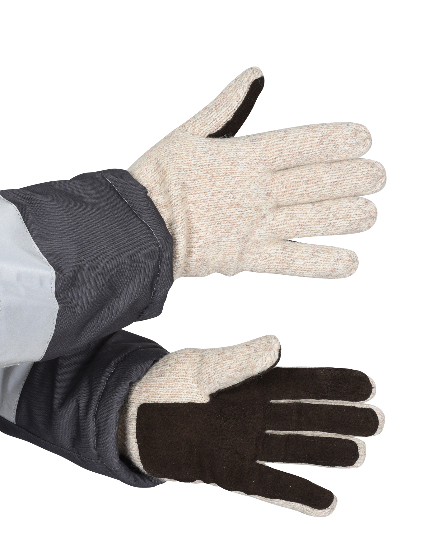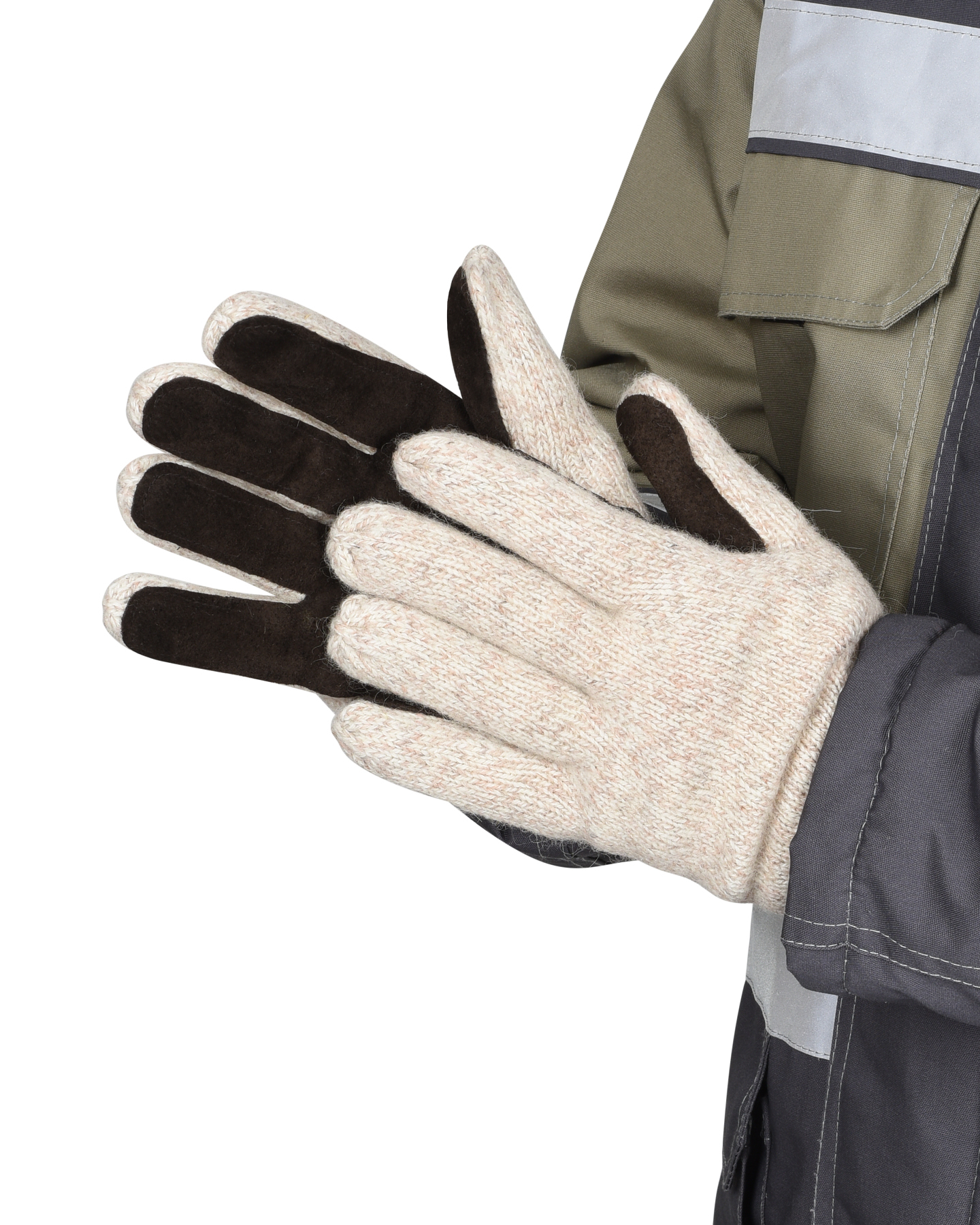 Перчатки из полушерстяной пряжи (шерсть 50%, акрил 50%) с утеплителем Тинсулейт С40 на флисовой подкладке, на ладонной стороне и пальцах с накладками из кожевенного спилка.