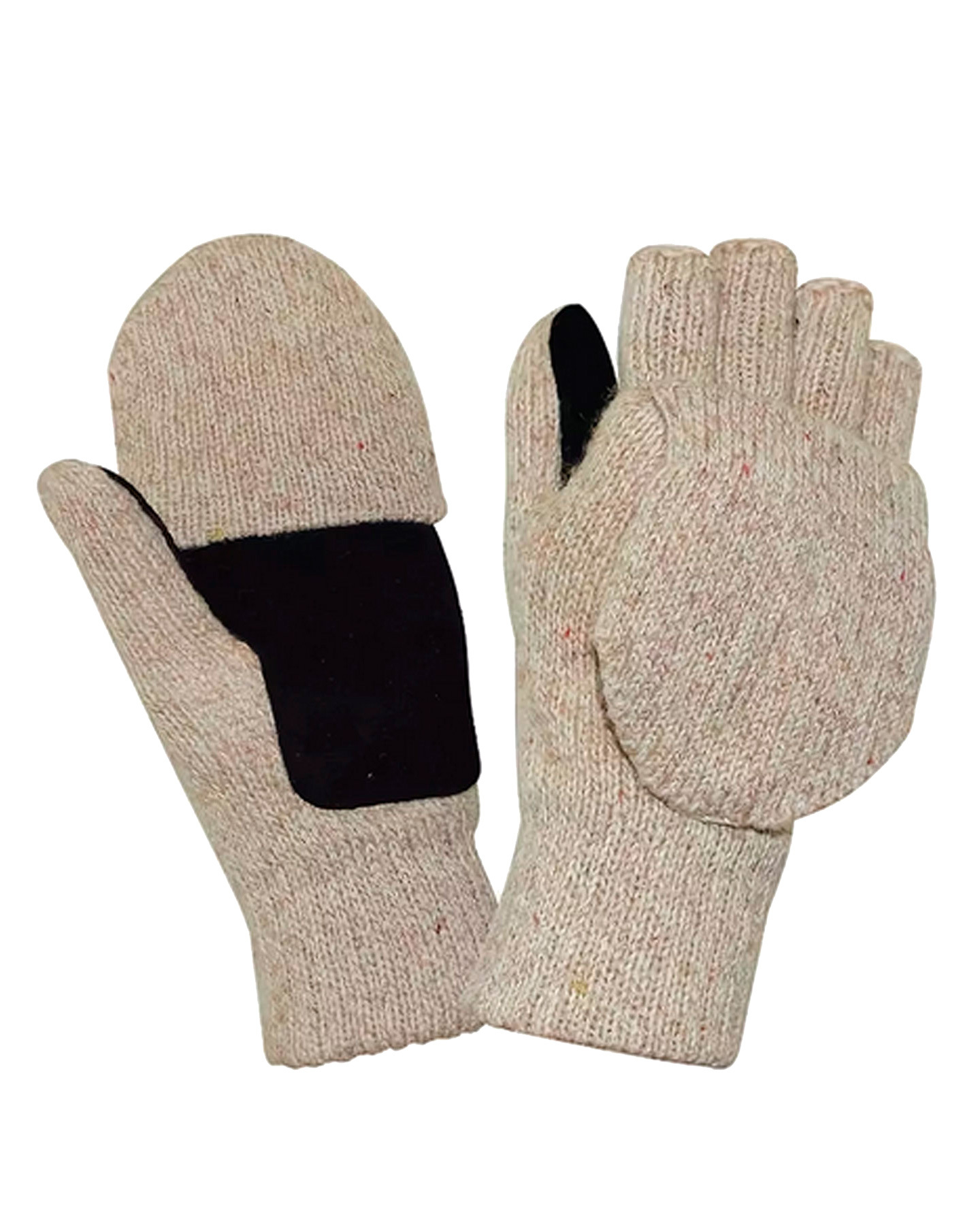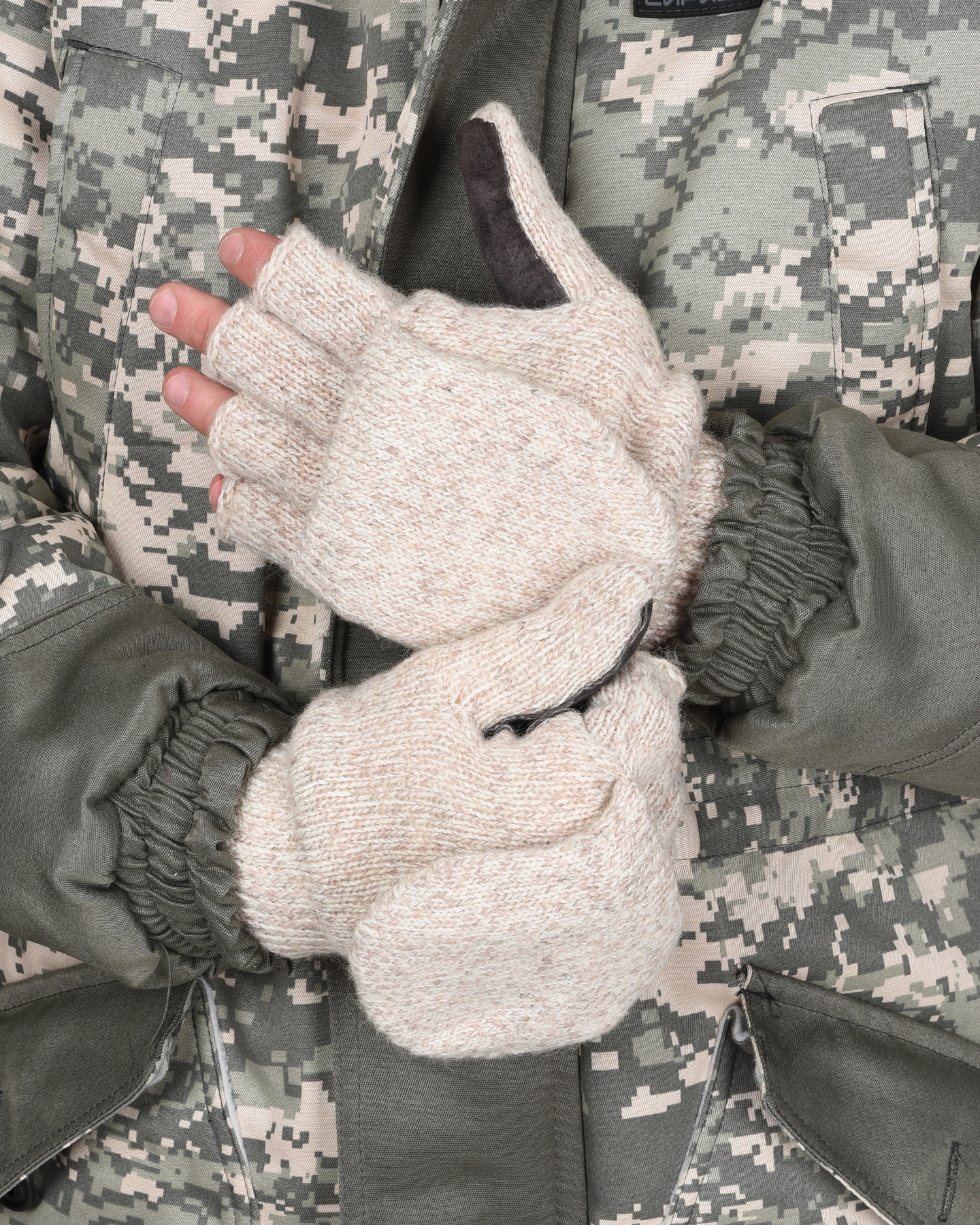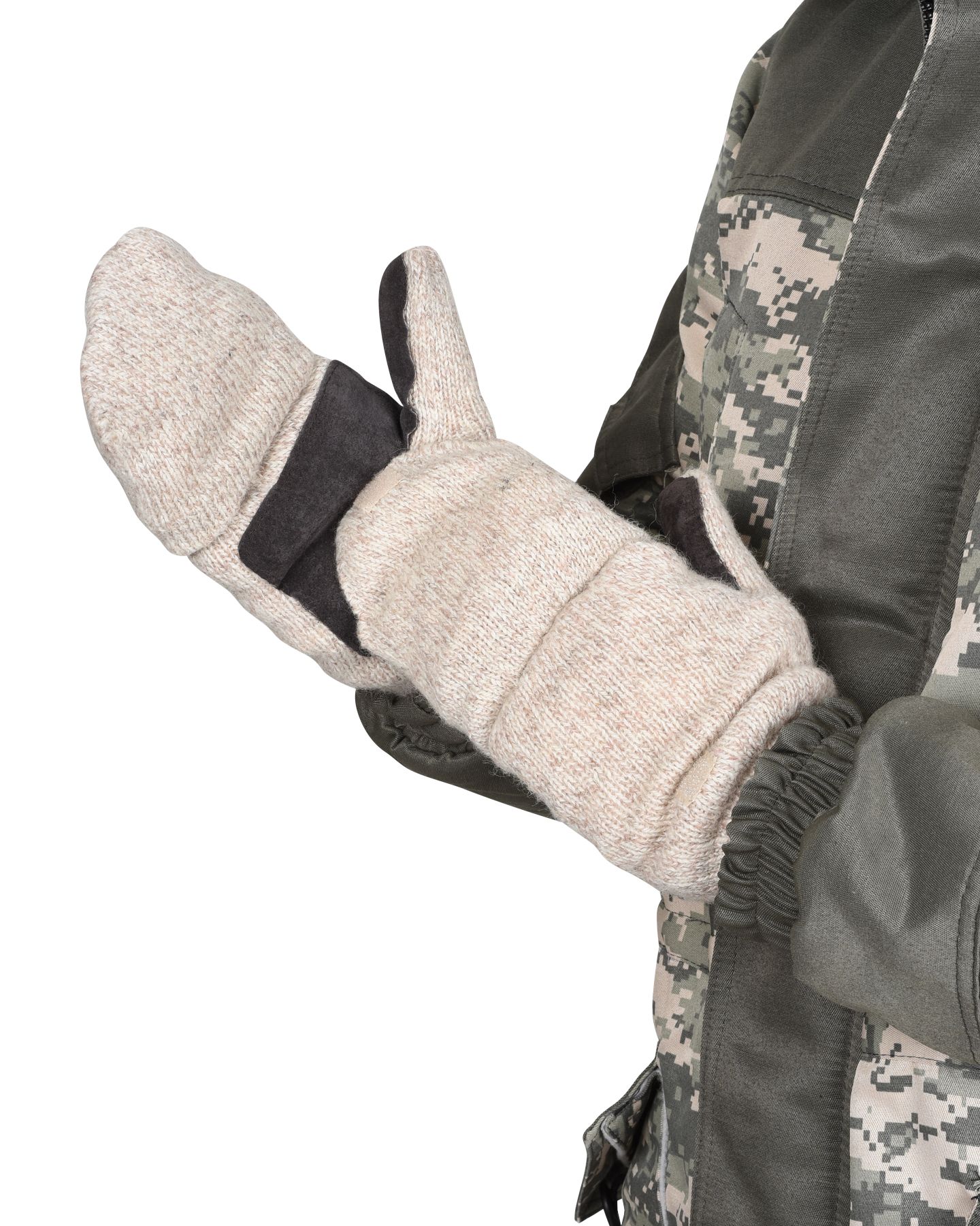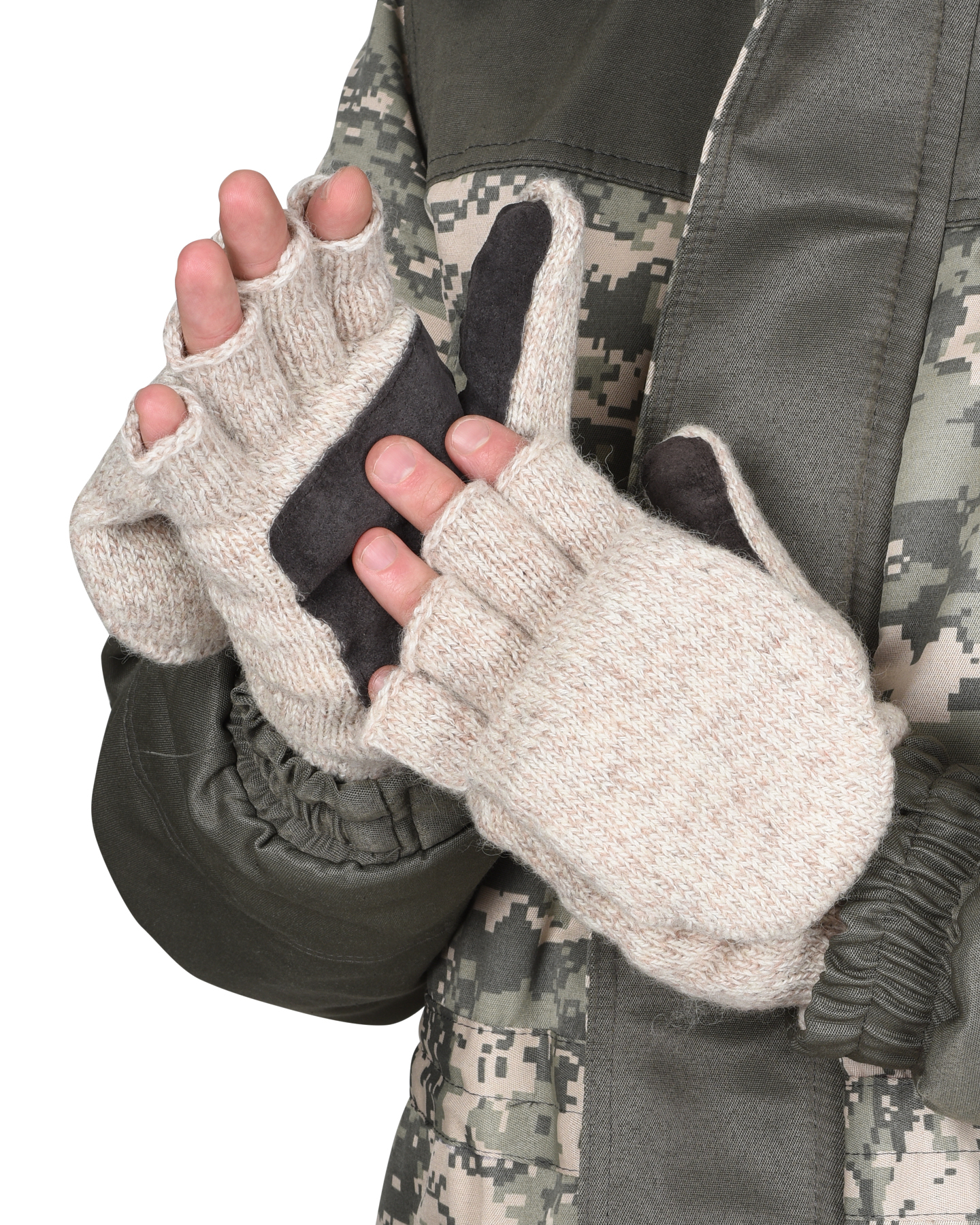 Перчатки из полушерстяной пряжи (шерсть 50%, акрил 50%) с утеплителем Тинсулейт С40 на флисовой подкладке, на ладонной стороне и пальцах с накладками из кожевенного спилка, на ладонной стороне с накладками из кожевенного спилка.