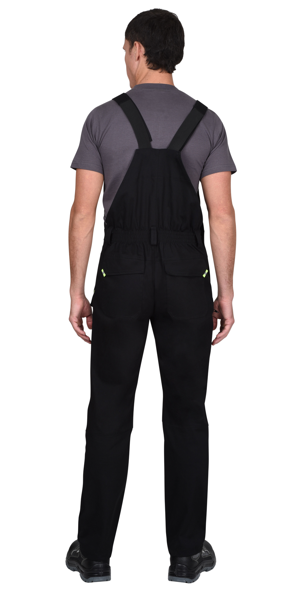 Полукомбинезон с декоративными элементами, с застёжками в среднем шве передних половинок гульфика на молнию, в правом боковом шве на кнопки, отрезным поясом спереди и нагрудником, многофункциональными карманами, со стянутой линией талии по спинке на эластичную ленту, для лучшего прилегания. Полукомбинезон с регулируемыми бретелями, объём по низу полукомбинезона регулируется шнуром с фиксатором.