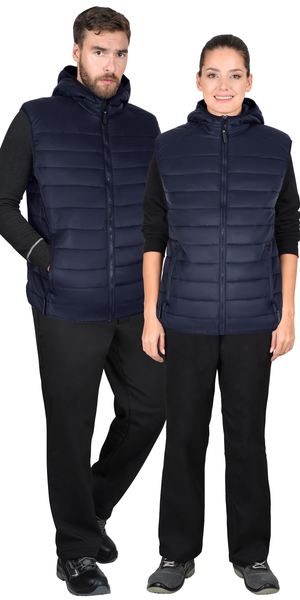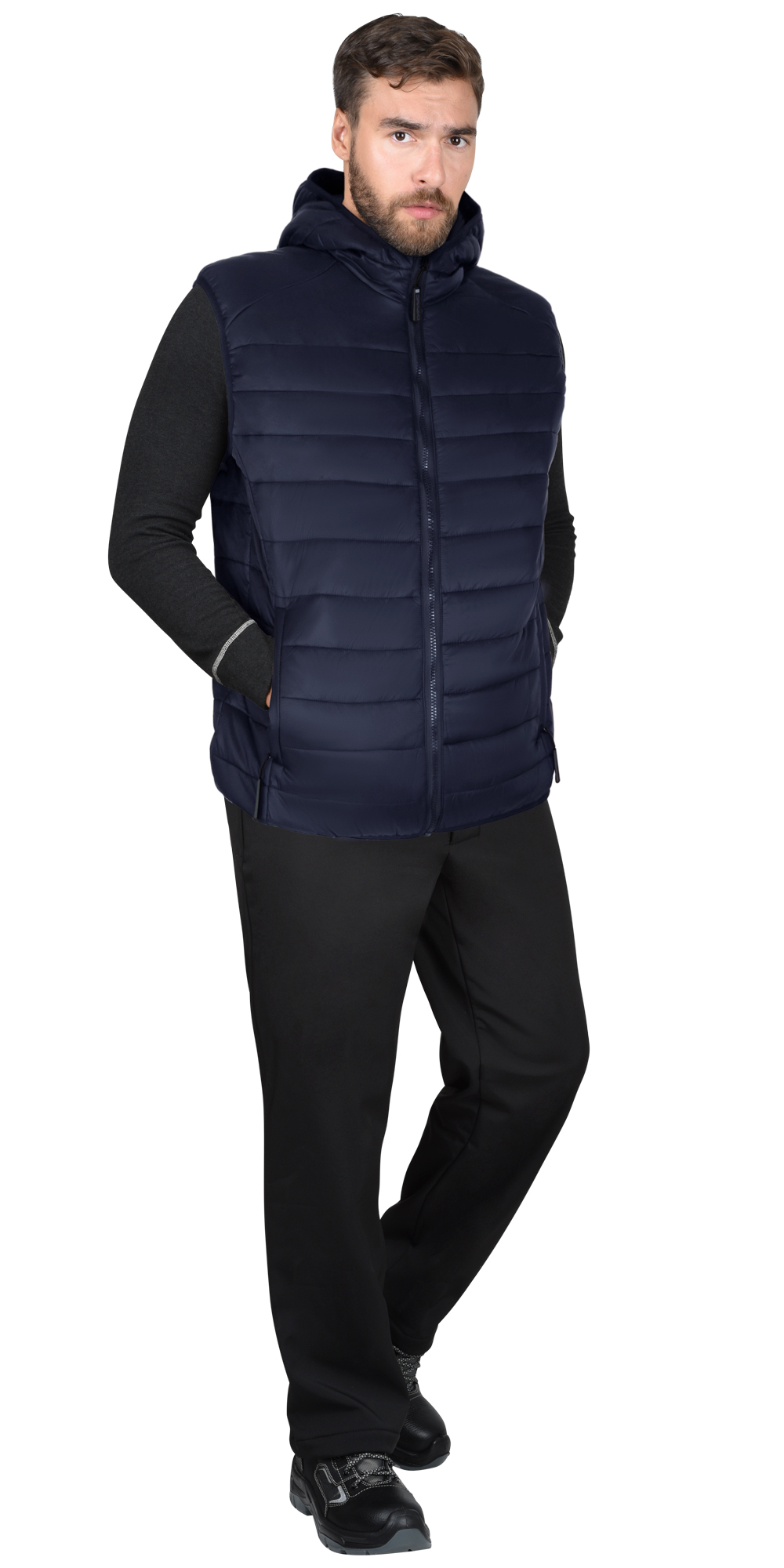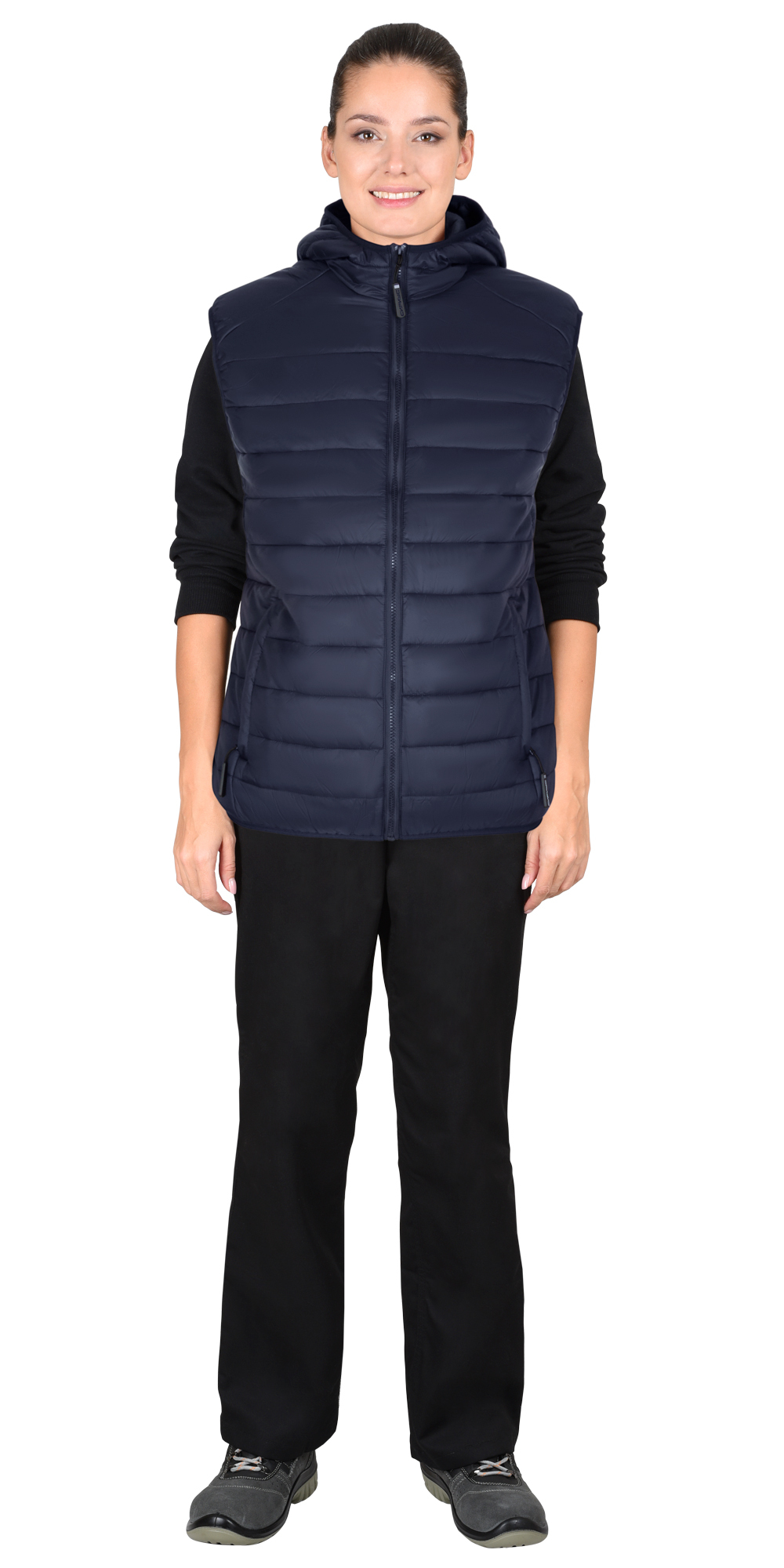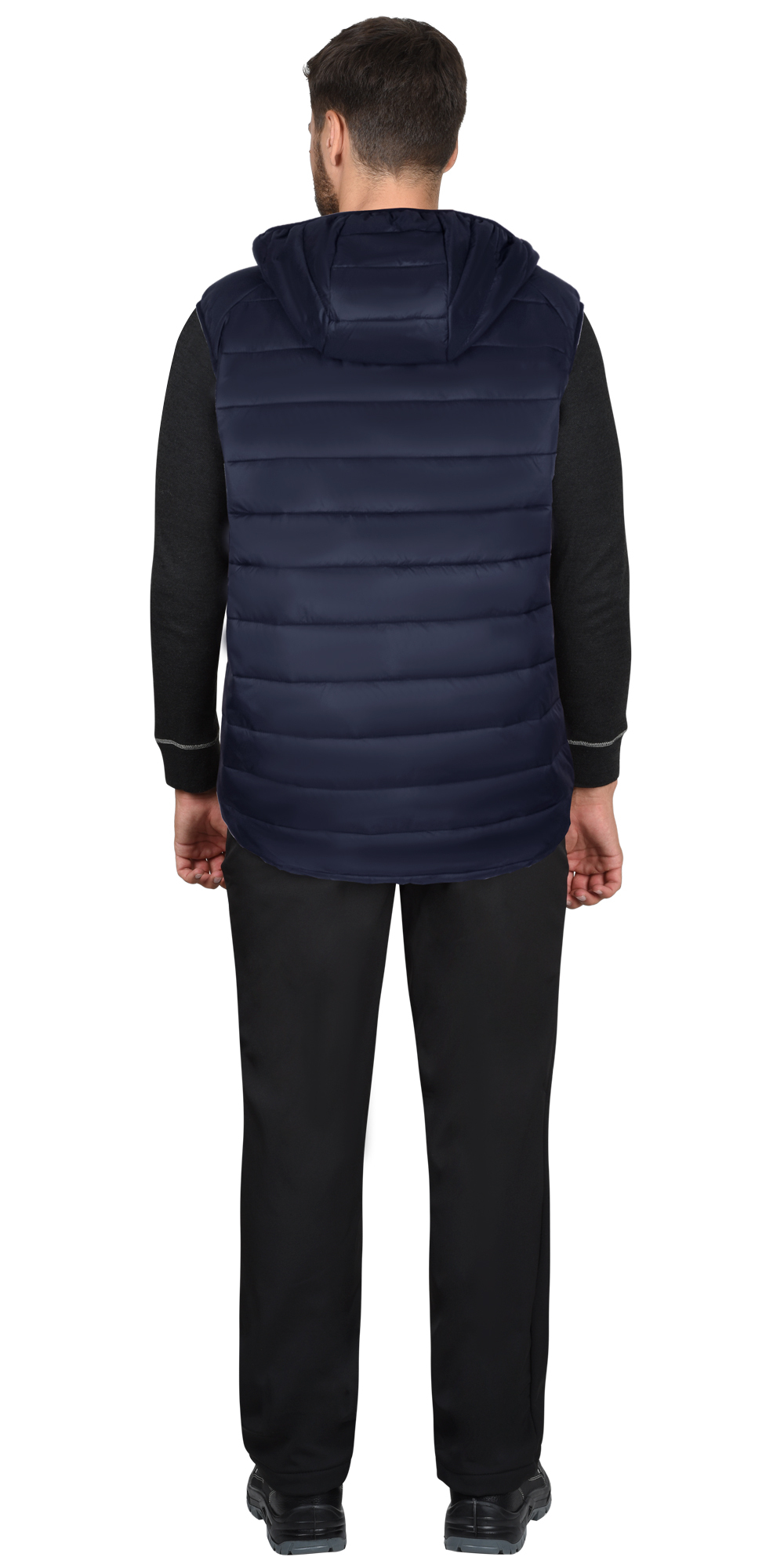 Жилет утепленный из стёганного полотна, с центральной бортовой застёжкой молния, с втачным капюшоном, с общей кокеткой полочек и спинки, с карманами с молнией в шве рельефа, с удлинённой фигурной линией низа на спинке. Низ куртки, пройма и лицевой вырез капюшона окантованы эластичной тесьмой.