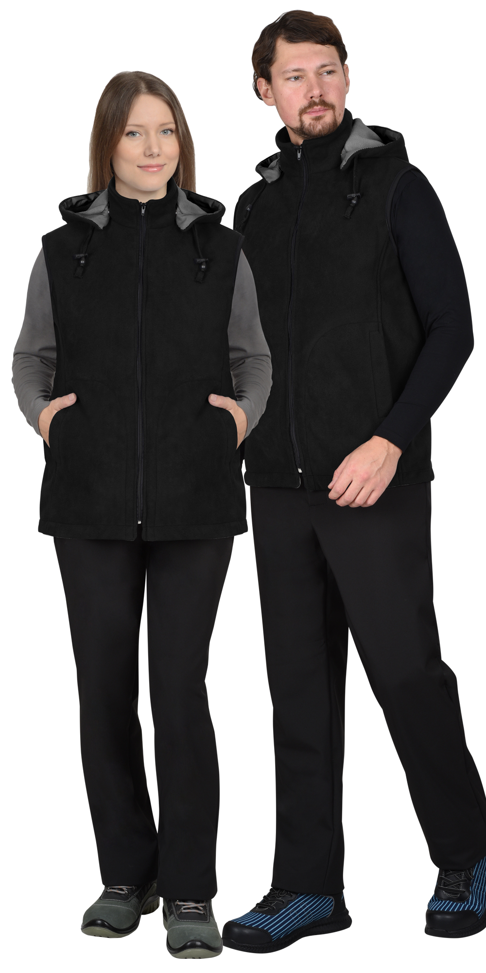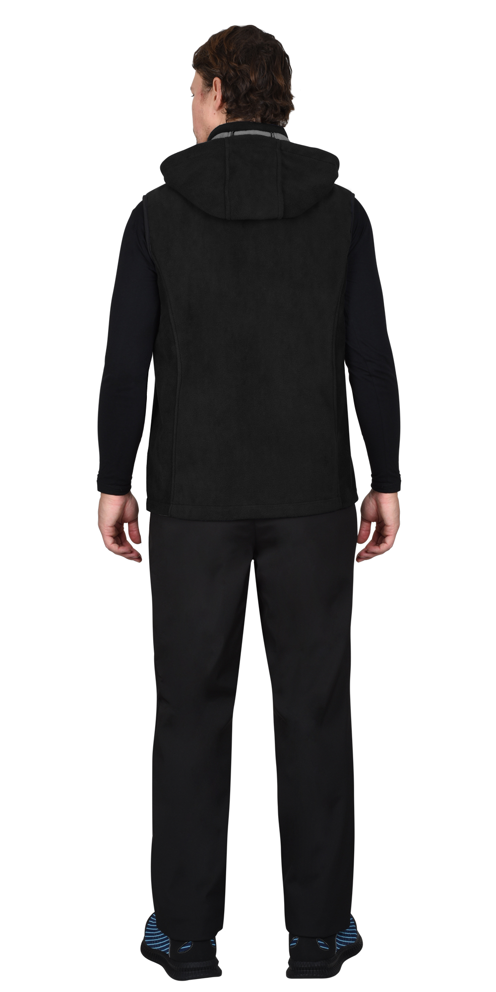Жилет из двустороннего флиса, без подкладки, прямого силуэта, с втачным воротником стойка, со съёмным капюшоном, со сквозной центральной, бортовой застёжкой на молнию от края воротника до низа изделия, с отрезными бочками, с нижними боковыми карманами в рельефе. Пройма окантована резинкой.
