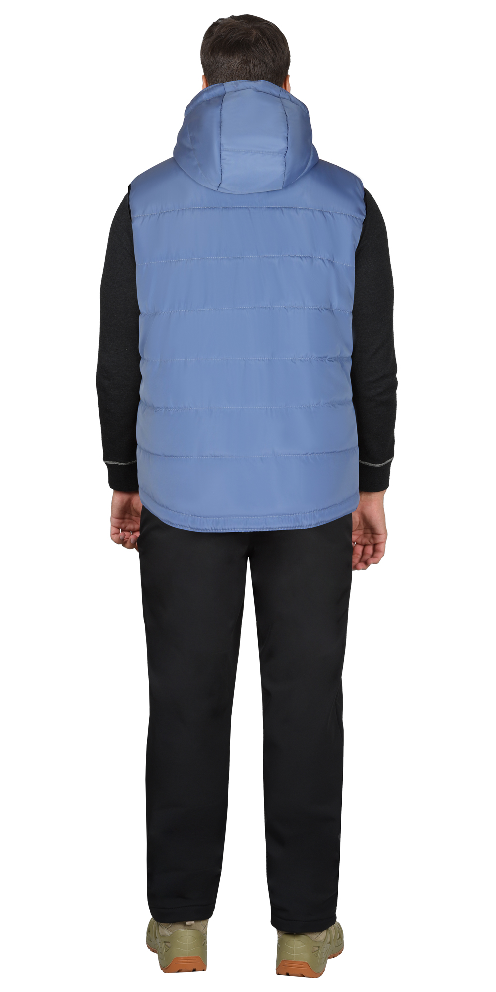 Жилет утеплённый, стёганный, на подкладке, прямого силуэта, с втачным капюшоном, с центральной застёжкой на молнию, закрытую ветрозащитным клапаном от края капюшона до низа изделия, застёгивающимся на кнопки. Жилет с одним нагрудным карманом с молнией и двумя нижними карманами. Спинка жилета, удлинённая с фигурной линией низа. Пройма окантована резинкой. Объём капюшона по лицевому вырезу регулируется шнуром с фиксаторами.