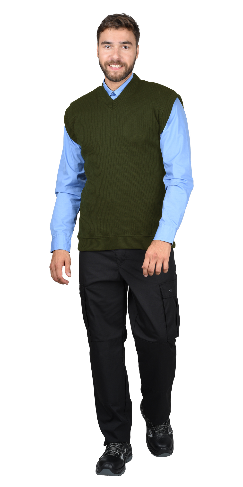 Жилет вязаный трикотажный оливкого цвета. Мужская теплая жилетка - идеальный выбор для тех, кто ищет комфорт и стиль в одном изделии. Теплый джемпер без рукавов в классическом цвете идеально подходит к любому стилю и гармонично сочетается с другими предметами гардероба.